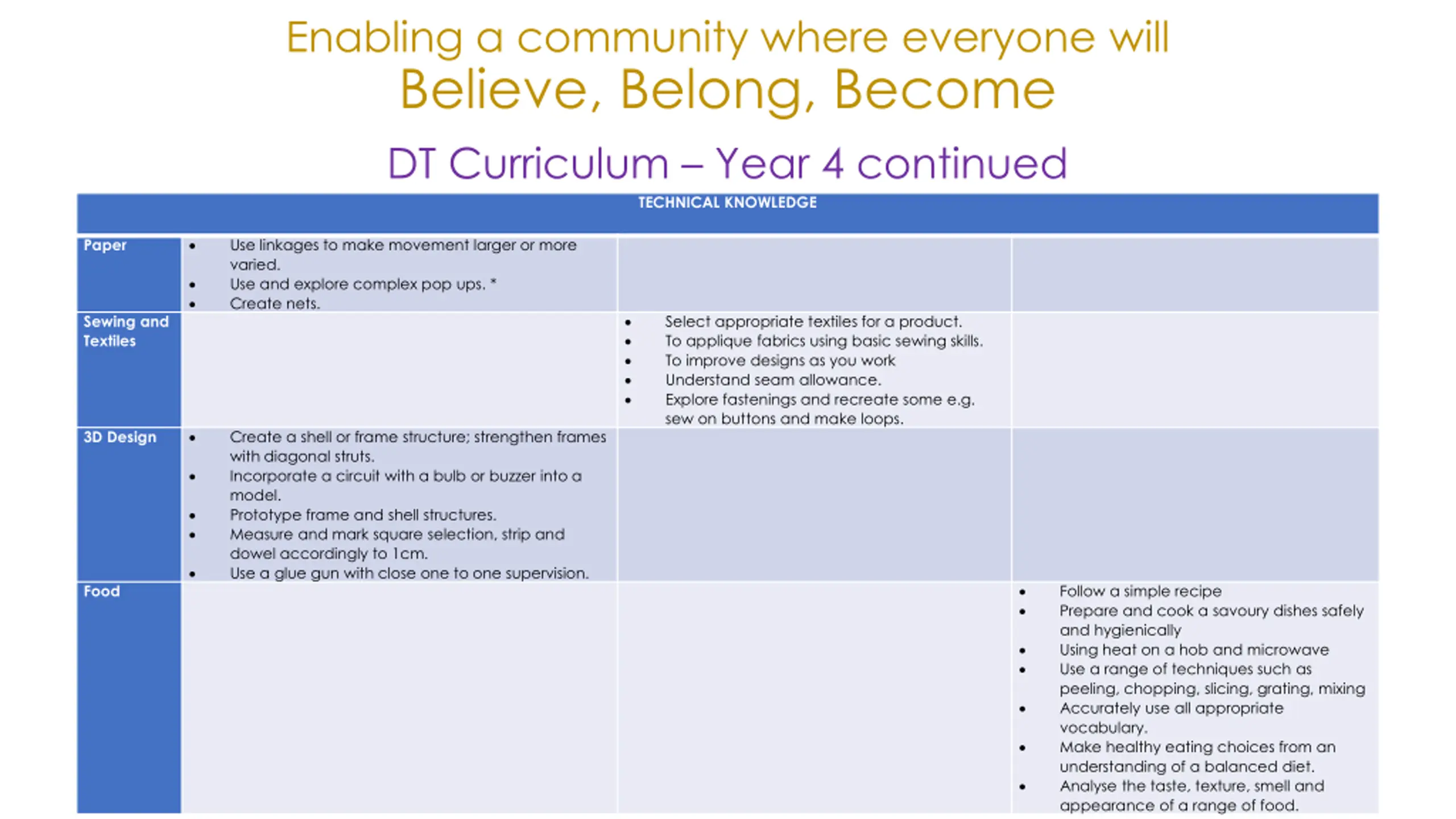Enabling a community where everyone will Believe, Belong, Become DT Curriculum Year 4 continued TECHNICAL KNOWLEDGE Paper Use linkages to make movement larger or more varied. Use and explore complex pop ups. * Create nets. Sewing and Textiles Select appropriate textiles for a product. To applique fabrics using basic sewing skills. To improve designs as you work Understand seam allowance. Explore fastenings and recreate some e.g. sew on buttons and make loops. 3D Design Create a shell or frame structure; strengthen frames with diagonal struts. Incorporate a circuit with a bulb or buzzer into a model. Prototype frame and shell structures. Measure and mark square selection, strip and dowel accordingly to 1cm. Use a glue gun with close one to one supervision. Food Follow a simple recipe Prepare and cook a savoury dishes safely and hygienically Using heat on a hob and microwave Use a range of techniques such as peeling, chopping, slicing, grating, mixing Accurately use all appropriate vocabulary. Make healthy eating choices from an understanding of a balanced diet. Analyse the taste, texture, smell and appearance of a range of food.