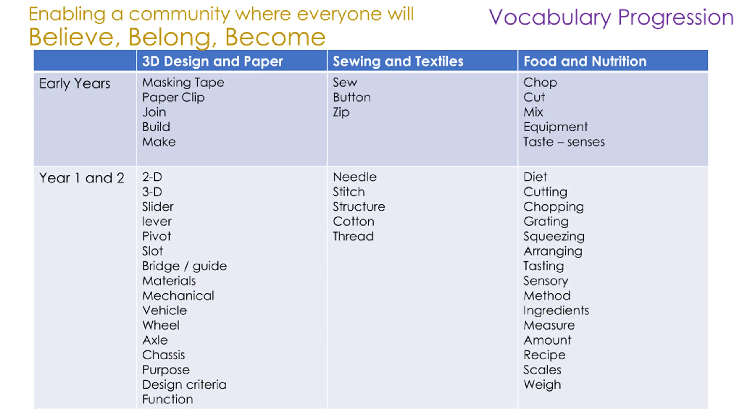 Enabling a community where everyone will Believe, Belong, Become Vocabulary Progression 3D Design and Paper Masking Tape Paper Clip Join Build Make Sewing and Textiles Sew Button Zip Food and Nutrition Chop Cut Mix Equipment Taste senses Early Years Year 1 and 2 2-D 3-D Slider lever Pivot Slot Bridge / guide Materials Mechanical Vehicle Wheel Axle Chassis Purpose Design criteria Function Needle Stitch Structure Cotton Thread Diet Cutting Chopping Grating Squeezing Arranging Tasting Sensory Method Ingredients Measure Amount Recipe Scales Weigh