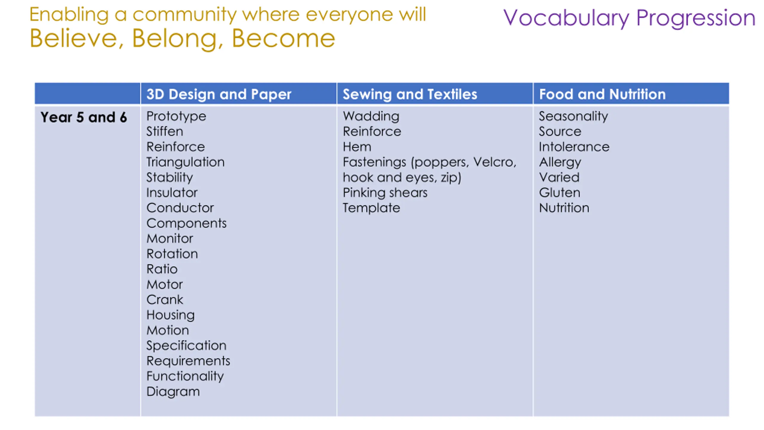 Enabling a community where everyone will Believe, Belong, Become Vocabulary Progression 3D Design and Paper Prototype Stiffen Reinforce Triangulation Stability Insulator Conductor Components Monitor Rotation Ratio Motor Crank Housing Motion Specification Requirements Functionality Diagram Sewing and Textiles Wadding Reinforce Hem Fastenings (poppers, Velcro, hook and eyes, zip) Pinking shears Template Food and Nutrition Seasonality Source Intolerance Allergy Varied Gluten Nutrition Year 5 and 6