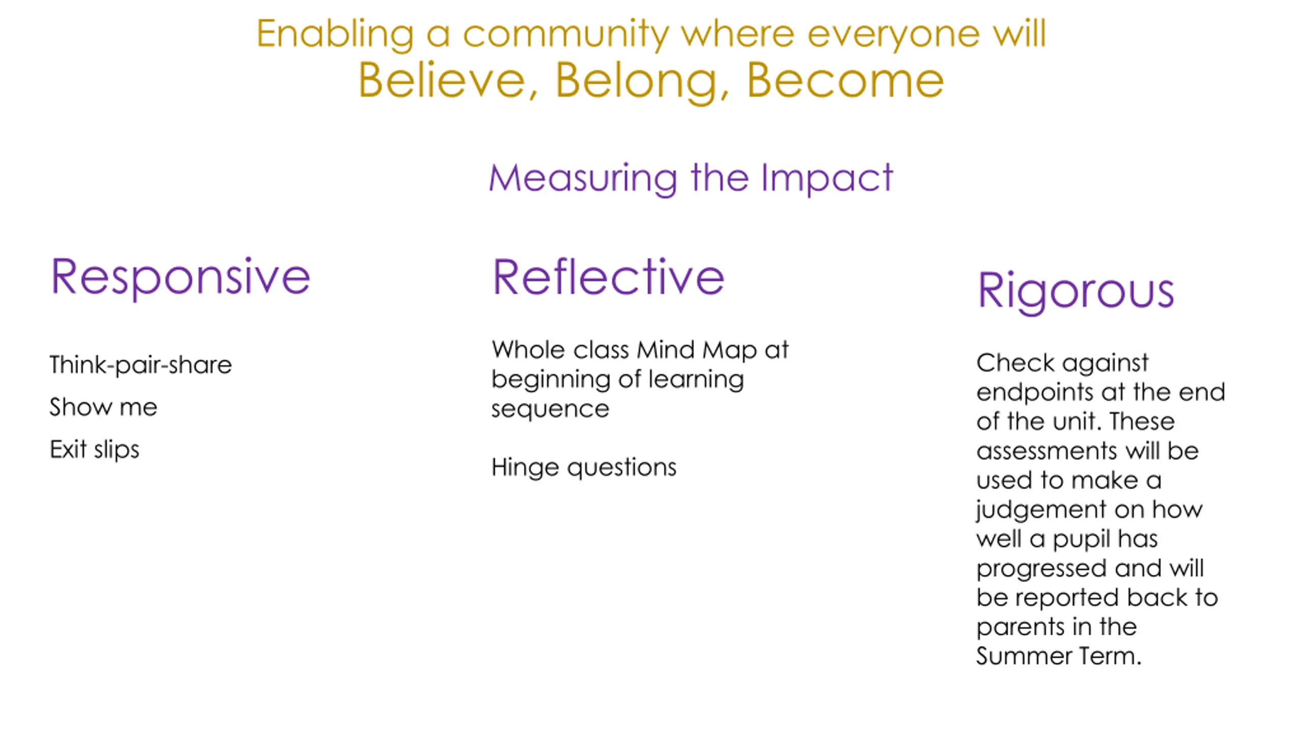 Enabling a community where everyone will Believe, Belong, Become Measuring the Impact Responsive Think-pair-share Reflective Rigorous Whole class Mind Map at beginning of learning sequence Check against endpoints at the end of the unit. These assessments will be used to make a judgement on how well a pupil has progressed and will be reported back to parents in the Summer Term. Show me Exit slips Hinge questions
