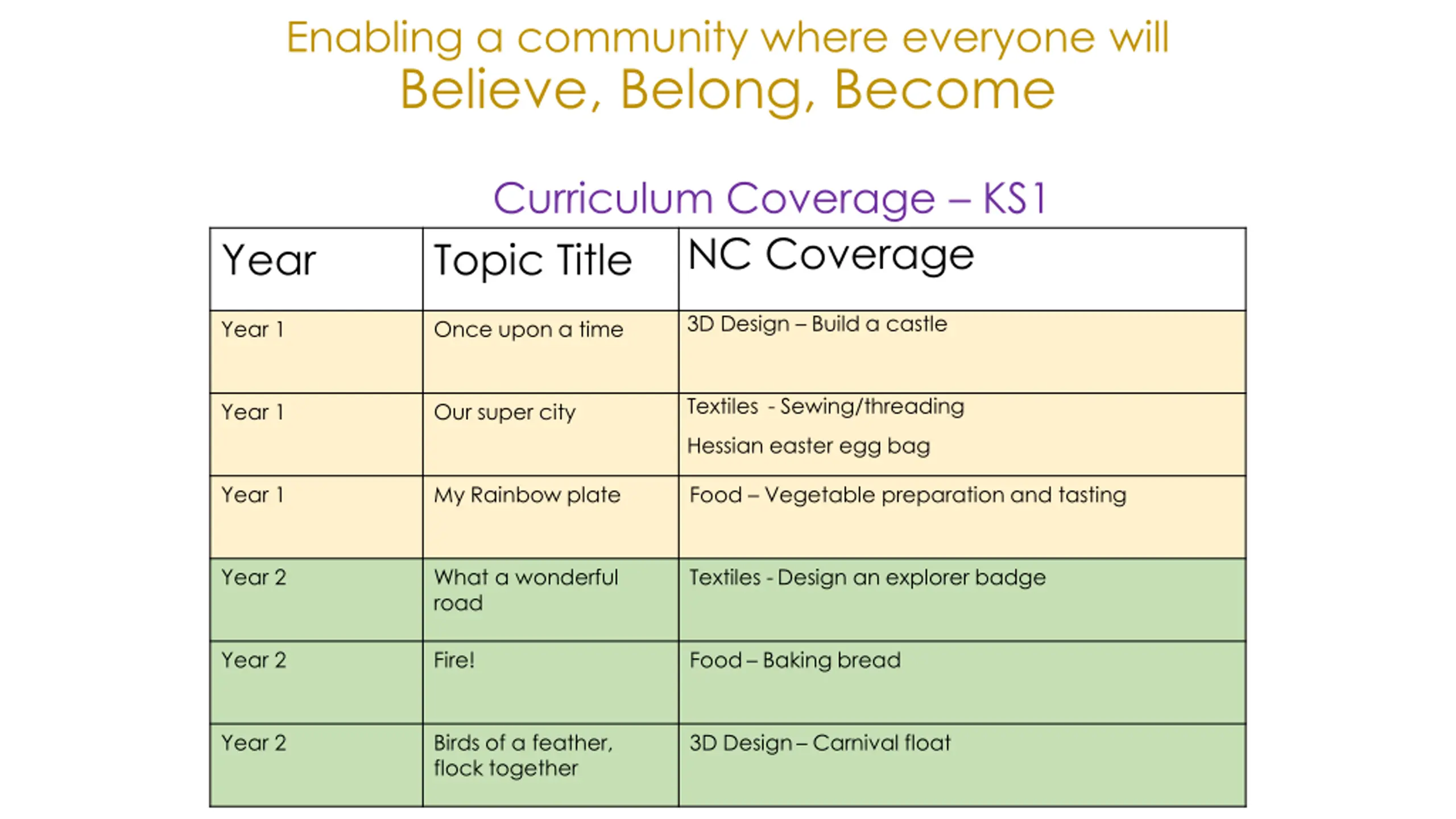 Enabling a community where everyone will Believe, Belong, Become Curriculum Coverage KS1 Topic Title NC Coverage Year 3D Design Build a castle Year 1 Once upon a time Textiles - Sewing/threading Year 1 Our super city Hessian easter egg bag Year 1 My Rainbow plate Food Vegetable preparation and tasting Year 2 What a wonderful road Textiles -Design an explorer badge Year 2 Fire! Food Baking bread Year 2 Birds of a feather, flock together 3D Design Carnival float