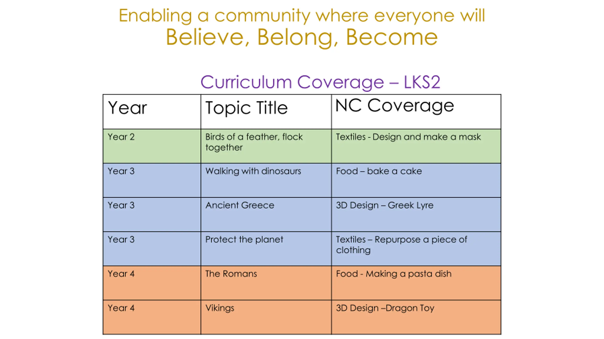 Enabling a community where everyone will Believe, Belong, Become Curriculum Coverage LKS2 Topic Title NC Coverage Year Year 2 Birds of a feather, flock together Textiles -Design and make a mask Year 3 Walking with dinosaurs Food bake a cake Year 3 Ancient Greece 3D Design Greek Lyre Year 3 Protect the planet Textiles Repurpose a piece of clothing Year 4 The Romans Food - Making a pasta dish Year 4 Vikings 3D Design Dragon Toy