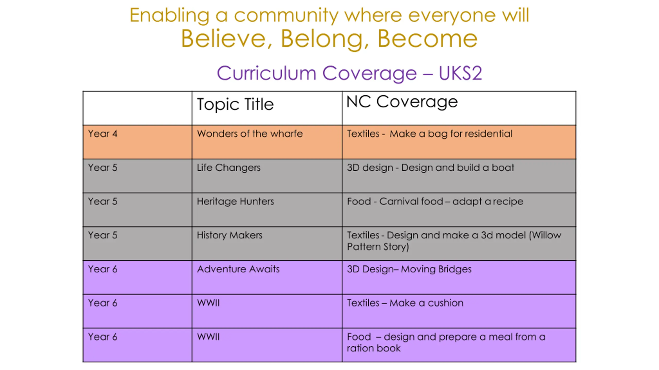 Enabling a community where everyone will Believe, Belong, Become Curriculum Coverage UKS2 Year Topic Title NC Coverage Year 4 Wonders of the wharfe Textiles - Make a bag for residential Year 5 Life Changers 3D design - Design and build a boat Year 5 Heritage Hunters Food - Carnival food adapt a recipe Year 5 History Makers Textiles- Design and make a 3d model (Willow Pattern Story) Year 6 Adventure Awaits 3D Design Moving Bridges Year 6 WWII Textiles Make a cushion Year 6 WWII Food design and prepare a meal from a ration book