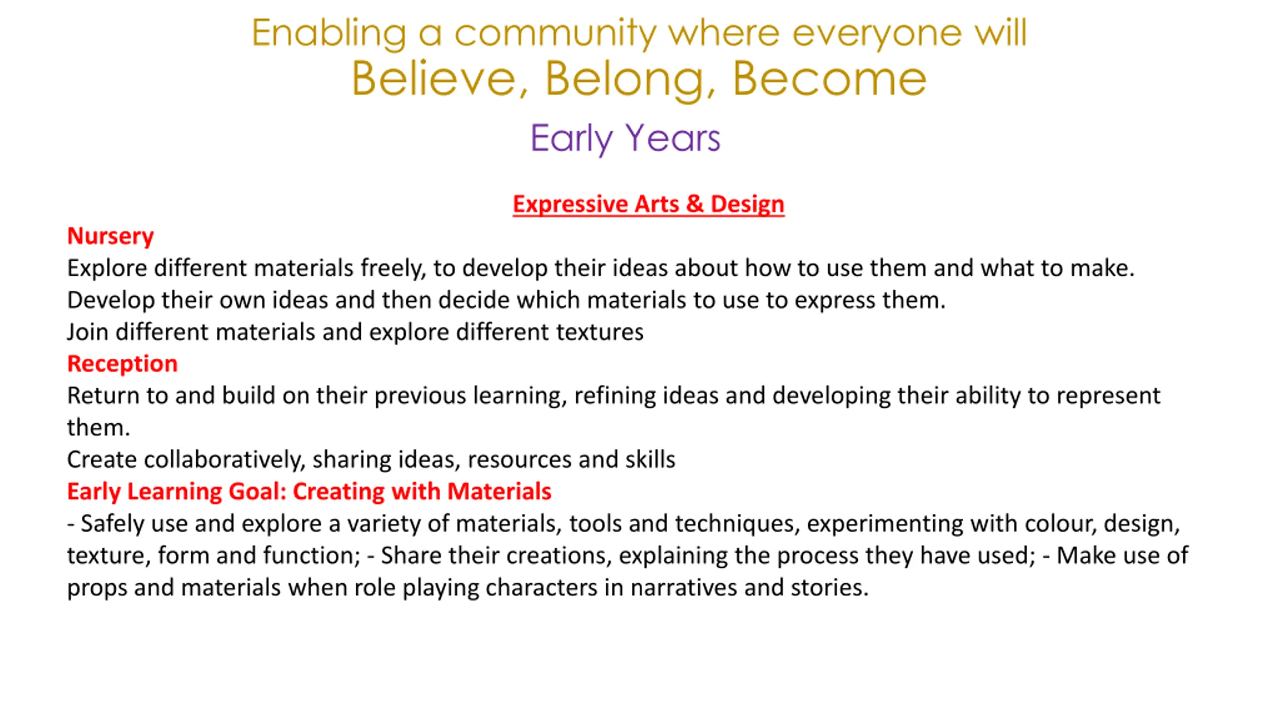 Enabling a community where everyone will Believe, Belong, Become Early Years Expressive Arts & Design Nursery Explore different materials freely, to develop their ideas about how to use them and what to make. Develop their own ideas and then decide which materials to use to express them. Join different materials and explore different textures Reception Return to and build on their previous learning, refining ideas and developing their ability to represent them. Create collaboratively, sharing ideas, resources and skills Early Learning Goal: Creating with Materials - Safely use and explore a variety of materials, tools and techniques, experimenting with colour, design, texture, form and function; - Share their creations, explaining the process they have used; - Make use of props and materials when role playing characters in narratives and stories.