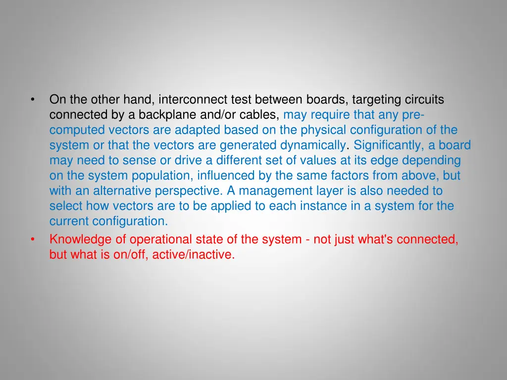 On the other hand, interconnect test between boards, targeting circuits connected by a backplane and/or cables, may require that any pre- computed vectors are adapted based on the physical configuration of the system or that the vectors are generated dynamically. Significantly, a board may need to sense or drive a different set of values at its edge depending on the system population, influenced by the same factors from above, but with an alternative perspective. A management layer is also needed to select how vectors are to be applied to each instance in a system for the current configuration. Knowledge of operational state of the system - not just what's connected, but what is on/off, active/inactive.