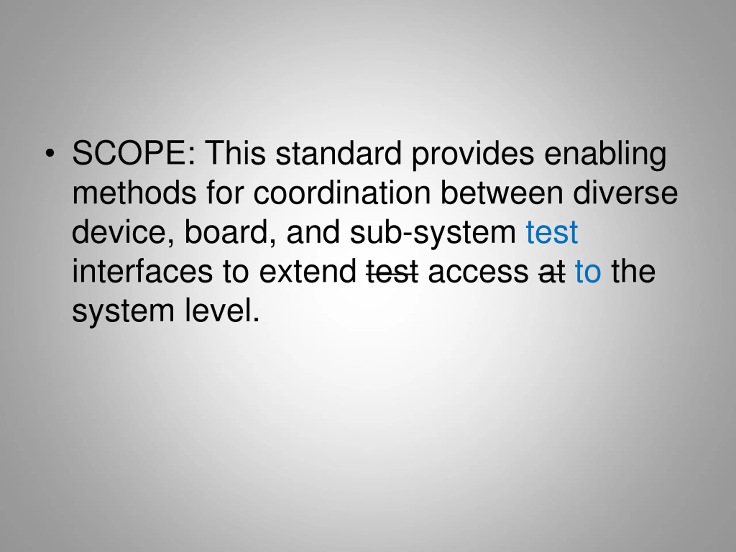 SCOPE DRAFT SCOPE: To provide a standardized enabling technology to extend device, board, and system level test interfaces for access at the system level; providing the coordination between diverse standards to fulfill a common purpose.