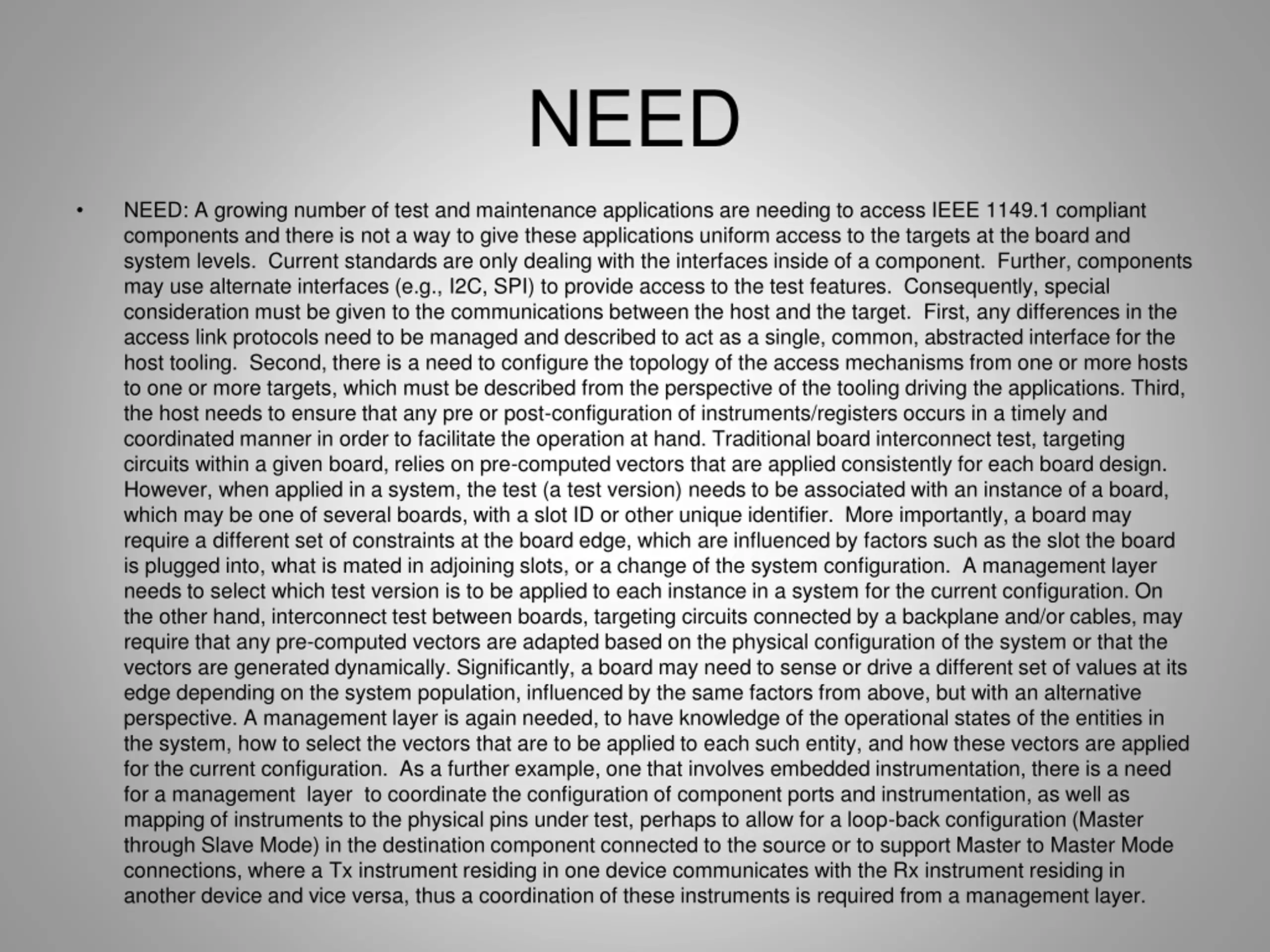 NEED NEED: A growing number of test and maintenance applications are needing to access IEEE 1149.1 compliant components and there is not a way to give these applications uniform access to the targets at the board and system levels. Current standards are only dealing with the interfaces inside of a component. Further, components may use alternate interfaces (e.g., I2C, SPI) to provide access to the test features. Consequently, special consideration must be given to the communications between the host and the target. First, any differences in the access link protocols need to be managed and described to act as a single, common, abstracted interface for the host tooling. Second, there is a need to configure the topology of the access mechanisms from one or more hosts to one or more targets, which must be described from the perspective of the tooling driving the applications. Third, the host needs to ensure that any pre or post- configuration of instruments/registers occurs in a timely and coordinated manner in order to facilitate the operation at hand. Traditional board interconnect test, targeting circuits within a given board, relies on pre-computed vectors that are applied consistently for each board design. However, when applied in a system, the test (a test version) needs to be associated with an instance of a board, which may be one of several boards, with a slot ID or other unique identifier. More importantly, a board may require a different set of constraints at the board edge, which are influenced by factors such as the slot the board is plugged into, what is mated in adjoining slots, or a change of the system configuration. A management layer needs to select which test version is to be applied to each instance in a system for the current configuration. (See slide 14 for suggested sentences) For example, there is a need to coordinate the configuration of component ports and instrumentation to allow for a loop-back configuration in the destination component connected to the source and mapping of instruments to pins under test.