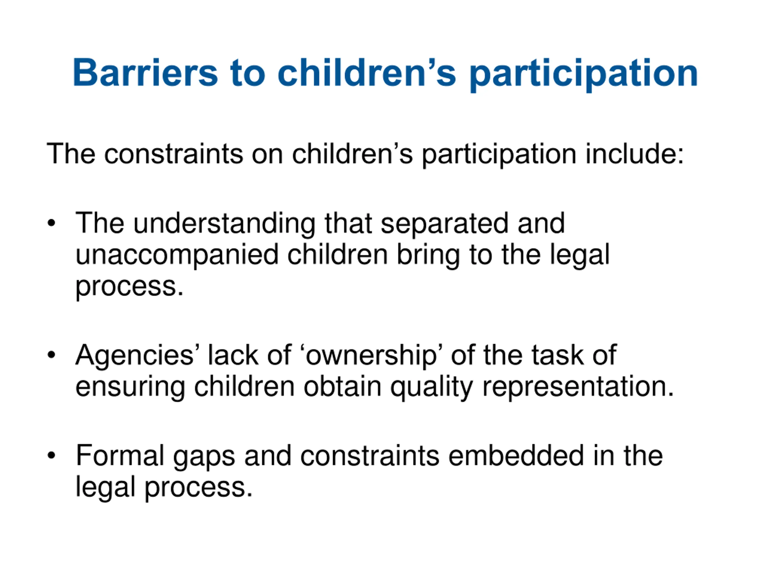 Barriers to childrens participation The constraints on children s participation include: The understanding that separated and unaccompanied children bring to the legal process. Agencies lack of ownership of the task of ensuring children obtain quality representation. Formal gaps and constraints embedded in the legal process.