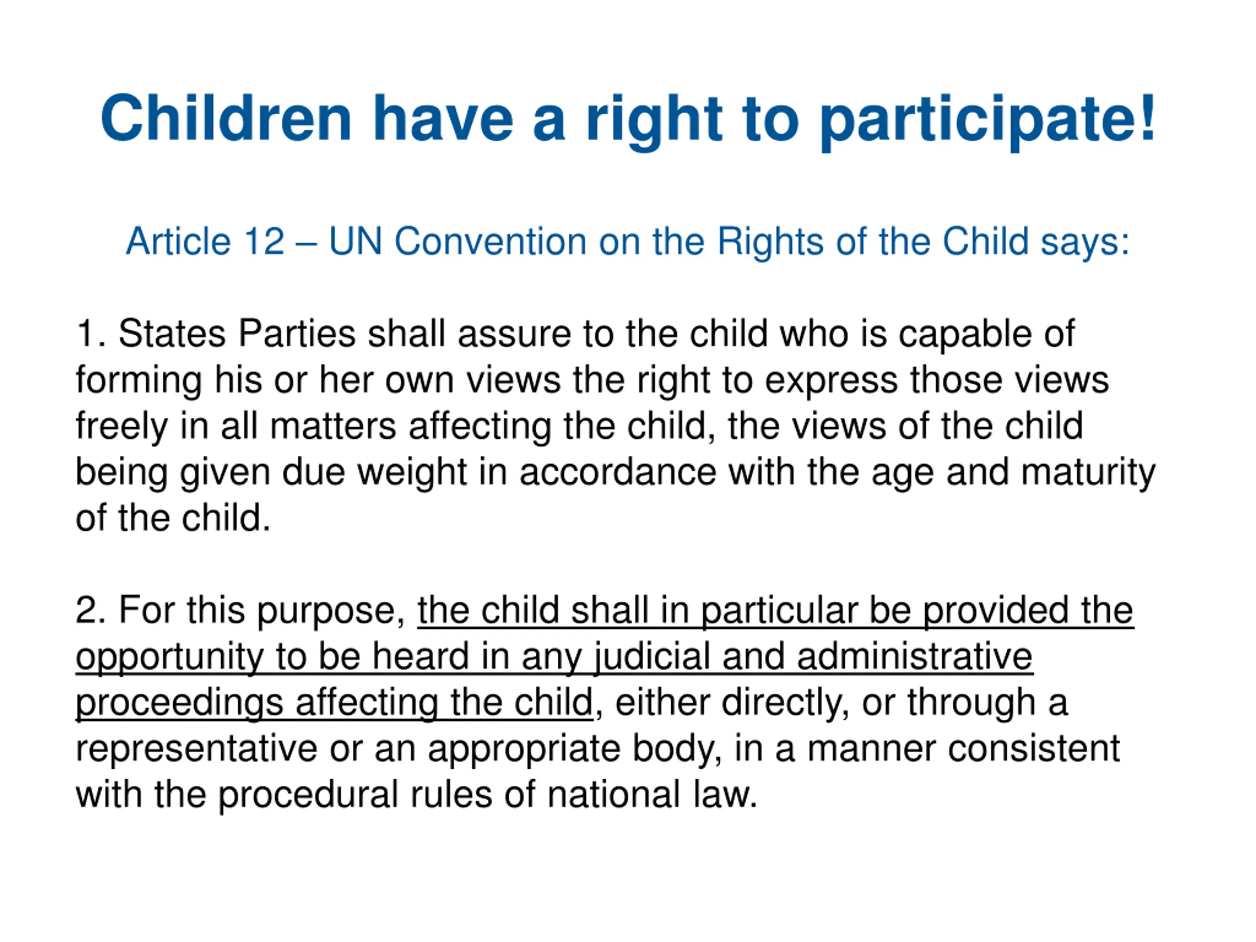 Children have a right to participate! Article 12 UN Convention on the Rights of the Child says: 1. States Parties shall assure to the child who is capable of forming his or her own views the right to express those views freely in all matters affecting the child, the views of the child being given due weight in accordance with the age and maturity of the child. 2. For this purpose, the child shall in particular be provided the opportunity to be heard in any judicial and administrative proceedings affecting the child, either directly, or through a representative or an appropriate body, in a manner consistent with the procedural rules of national law.