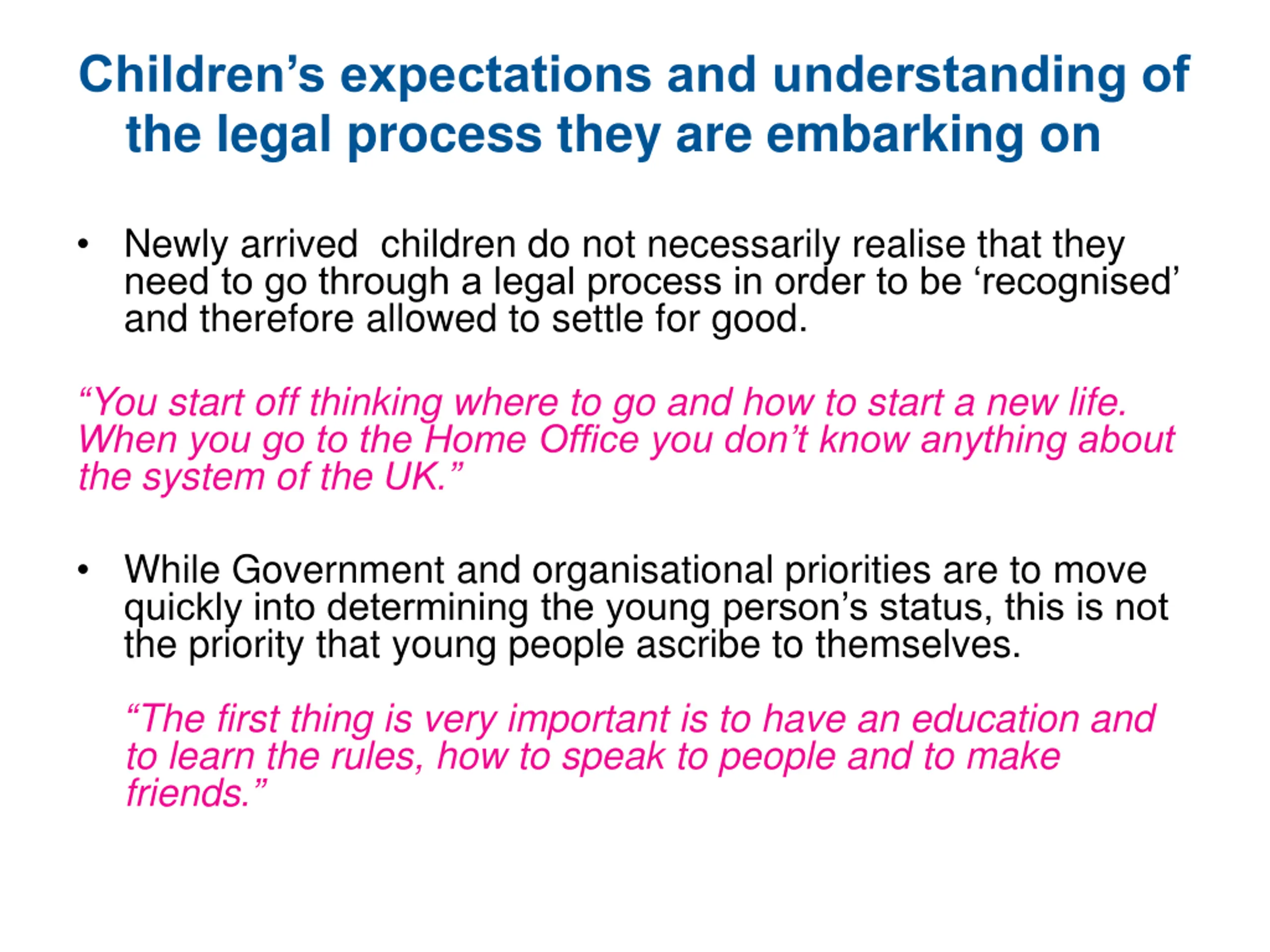 Childrens expectations and understanding of the legal process they are embarking on Newly arrived children do not necessarily realise that they need to go through a legal process in order to be recognised and therefore allowed to settle for good. You start off thinking where to go and how to start a new life. When you go to the Home Office you don t know anything about the system of the UK. While Government and organisational priorities are to move quickly into determining the young person s status, this is not the priority that young people ascribe to themselves. The first thing is very important is to have an education and to learn the rules, how to speak to people and to make friends.