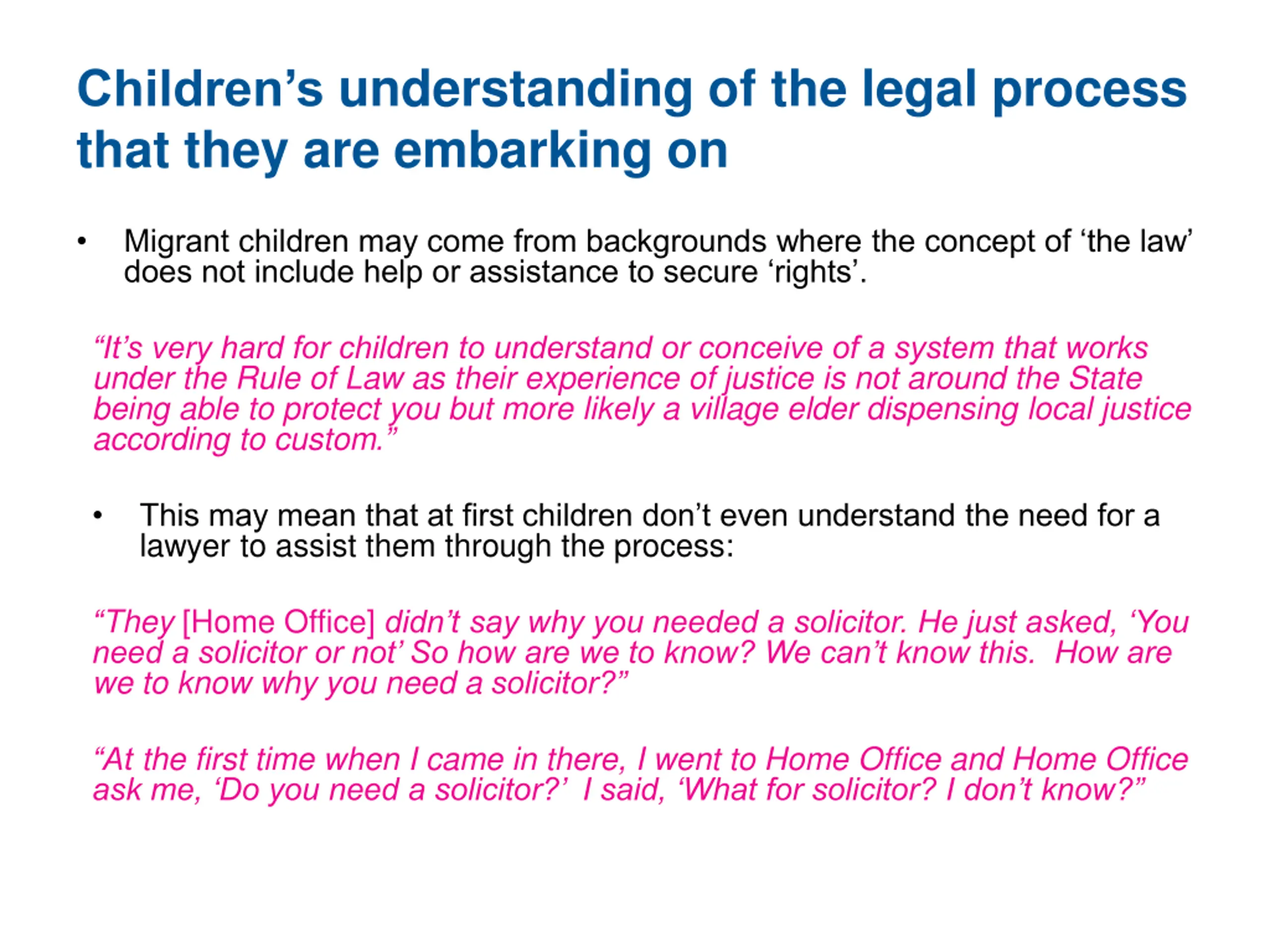 Childrens understanding of the legal process that they are embarking on Migrant children may come from backgrounds where the concept of the law does not include help or assistance to secure rights . It s very hard for children to understand or conceive of a system that works under the Rule of Law as their experience of justice is not around the State being able to protect you but more likely a village elder dispensing local justice according to custom. This may mean that at first children don t even understand the need for a lawyer to assist them through the process: They [Home Office] didn t say why you needed a solicitor. He just asked, You need a solicitor or not So how are we to know? We can t know this. How are we to know why you need a solicitor? At the first time when I came in there, I went to Home Office and Home Office ask me, Do you need a solicitor? I said, What for solicitor? I don t know?