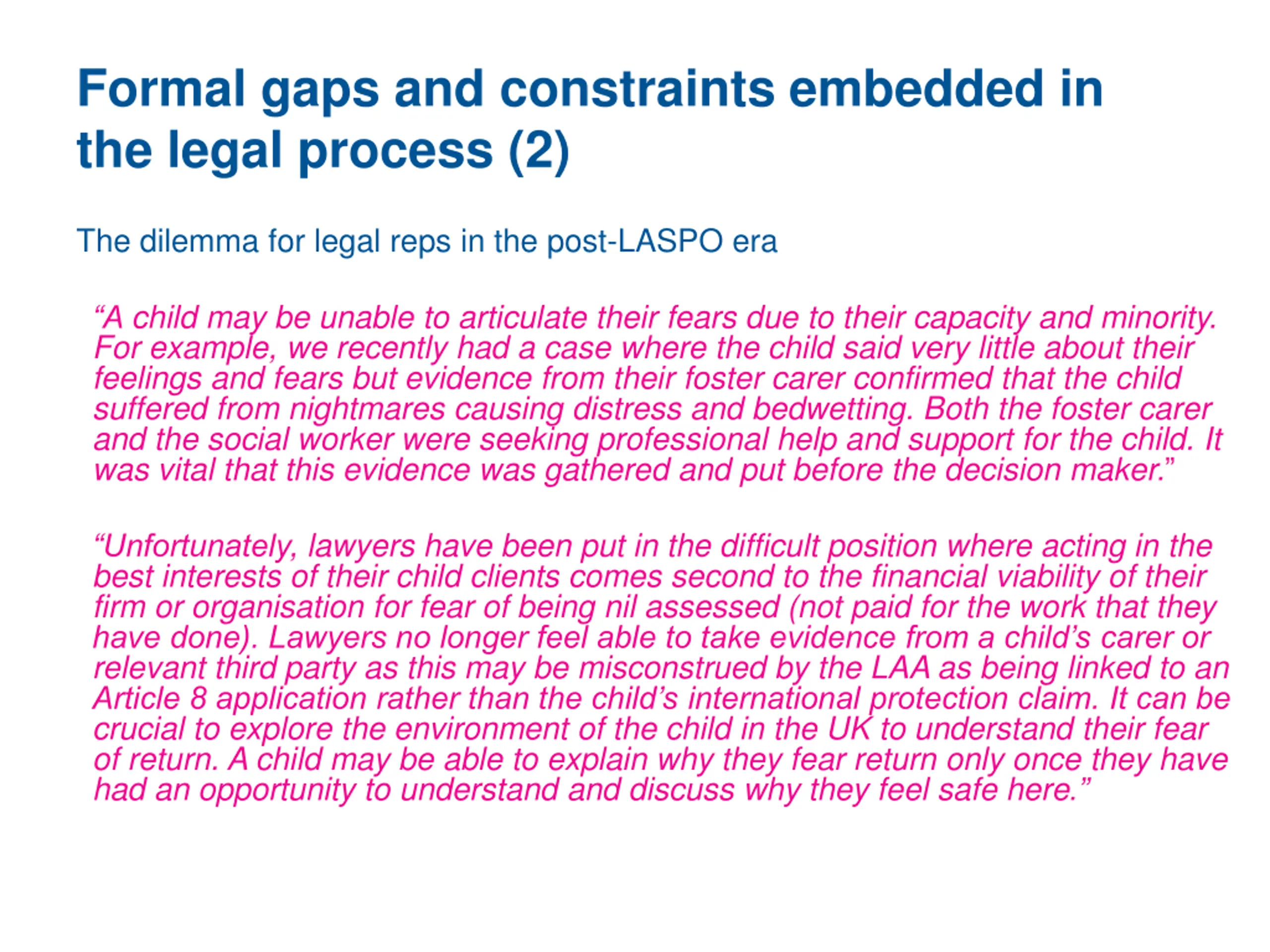 Formal gaps and constraints embedded in the legal process (2) The dilemma for legal reps in the post-LASPO era A child may be unable to articulate their fears due to their capacity and minority. For example, we recently had a case where the child said very little about their feelings and fears but evidence from their foster carer confirmed that the child suffered from nightmares causing distress and bedwetting. Both the foster carer and the social worker were seeking professional help and support for the child. It was vital that this evidence was gathered and put before the decision maker. Unfortunately, lawyers have been put in the difficult position where acting in the best interests of their child clients comes second to the financial viability of their firm or organisation for fear of being nil assessed (not paid for the work that they have done). Lawyers no longer feel able to take evidence from a child s carer or relevant third party as this may be misconstrued by the LAA as being linked to an Article 8 application rather than the child s international protection claim. It can be crucial to explore the environment of the child in the UK to understand their fear of return. A child may be able to explain why they fear return only once they have had an opportunity to understand and discuss why they feel safe here.