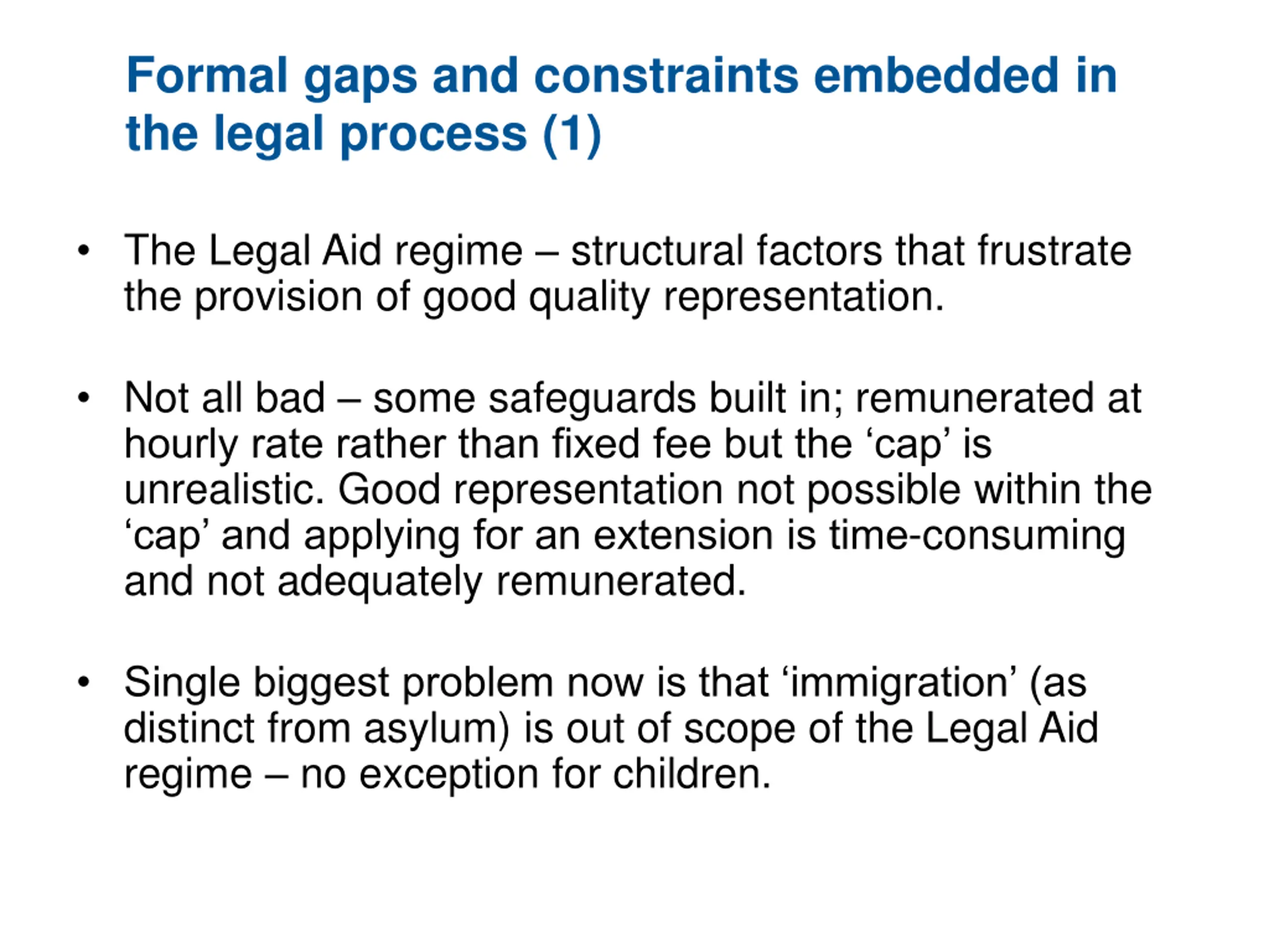 Formal gaps and constraints embedded in the legal process (1) The Legal Aid regime structural factors that frustrate the provision of good quality representation. Not all bad some safeguards built in; remunerated at hourly rate rather than fixed fee but the cap is unrealistic. Good representation not possible within the cap and applying for an extension is time-consuming and not adequately remunerated. Single biggest problem now is that immigration (as distinct from asylum) is out of scope of the Legal Aid regime no exception for children.