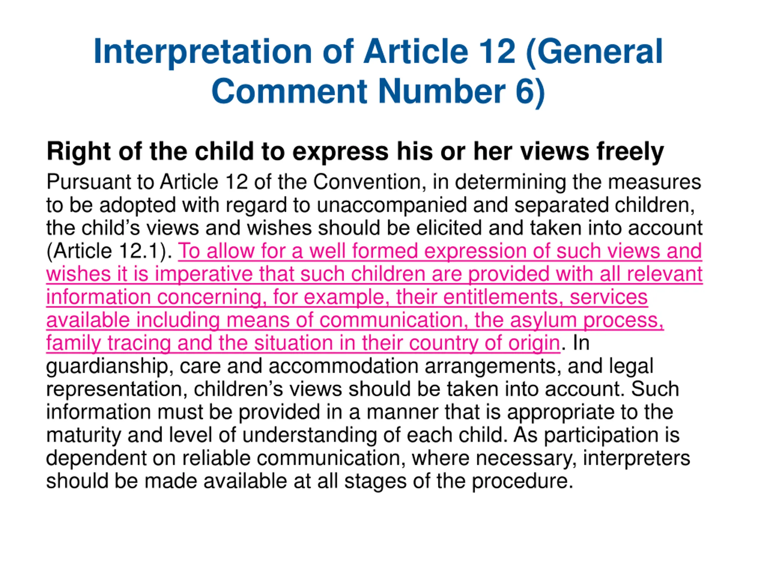 Interpretation of Article 12 (General Comment Number 6) Right of the child to express his or her views freely Pursuant to Article 12 of the Convention, in determining the measures to be adopted with regard to unaccompanied and separated children, the child s views and wishes should be elicited and taken into account (Article 12.1). To allow for a well formed expression of such views and wishes it is imperative that such children are provided with all relevant information concerning, for example, their entitlements, services available including means of communication, the asylum process, family tracing and the situation in their country of origin. In guardianship, care and accommodation arrangements, and legal representation, children s views should be taken into account. Such information must be provided in a manner that is appropriate to the maturity and level of understanding of each child. As participation is dependent on reliable communication, where necessary, interpreters should be made available at all stages of the procedure.