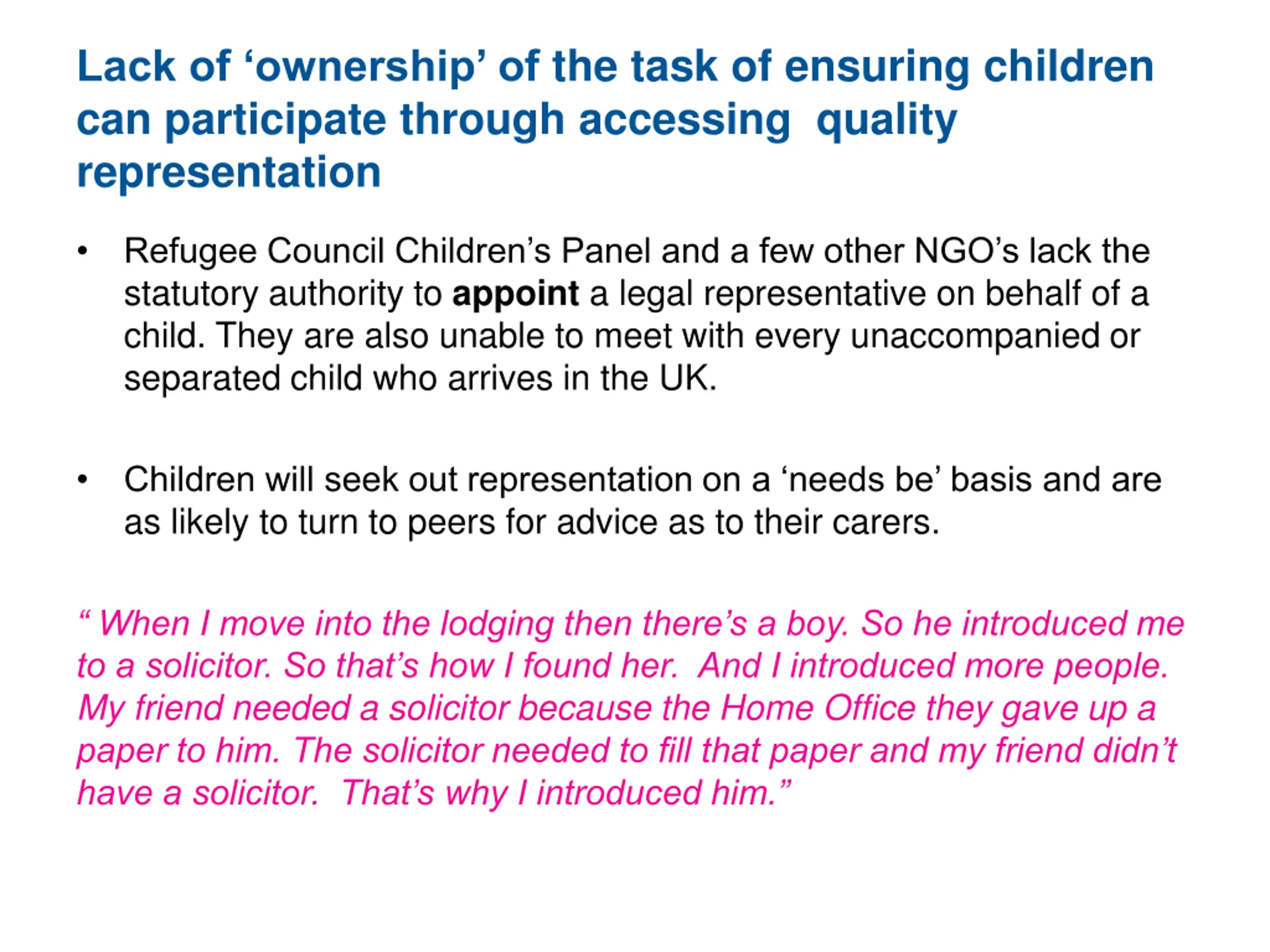Lack of ownership of the task of ensuring children can participate through accessing quality representation Refugee Council Children s Panel and a few other NGO s lack the statutory authority to appoint a legal representative on behalf of a child. They are also unable to meet with every unaccompanied or separated child who arrives in the UK. Children will seek out representation on a needs be basis and are as likely to turn to peers for advice as to their carers. When I move into the lodging then there s a boy. So he introduced me to a solicitor. So that s how I found her. And I introduced more people. My friend needed a solicitor because the Home Office they gave up a paper to him. The solicitor needed to fill that paper and my friend didn t have a solicitor. That s why I introduced him.