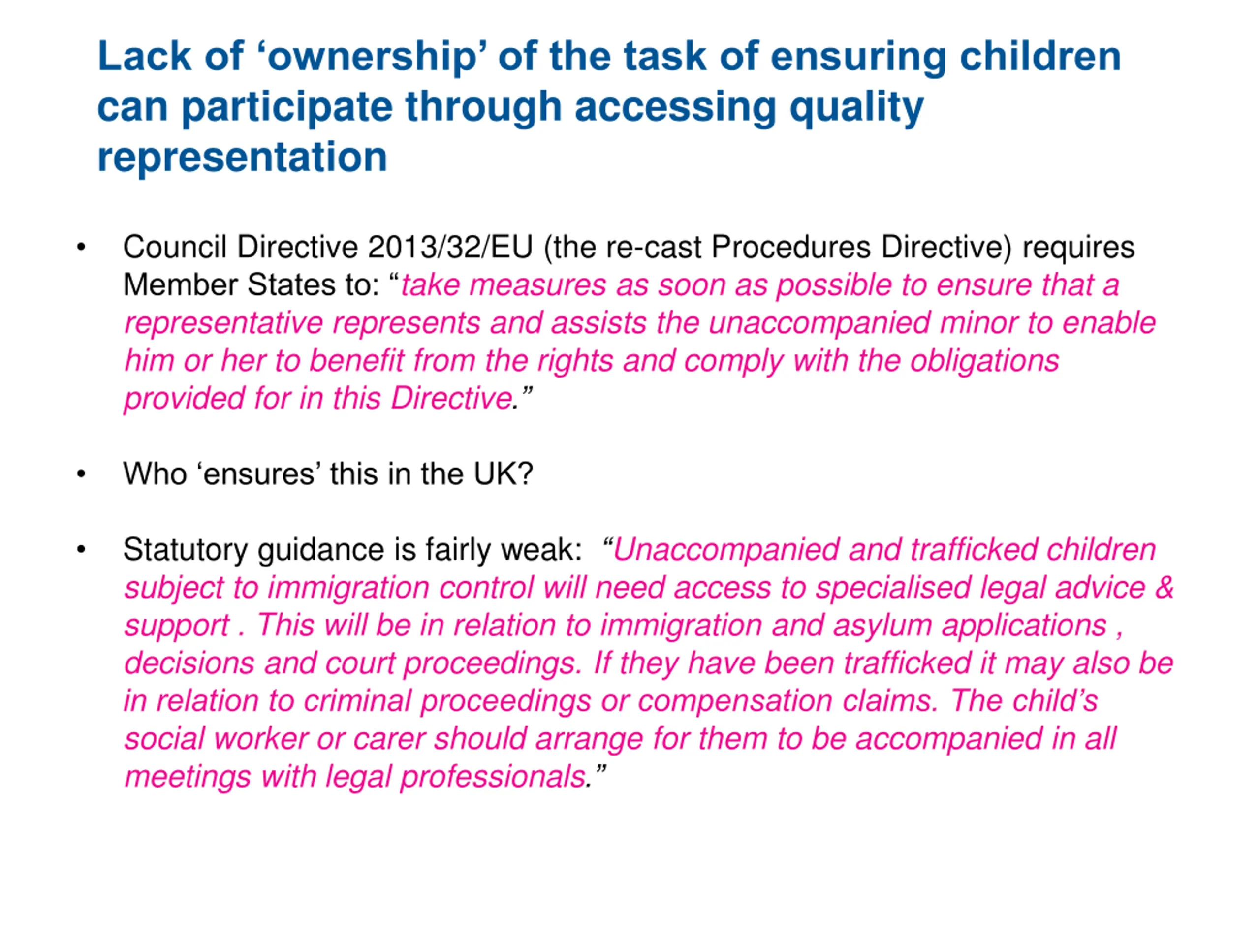 Lack of ownership of the task of ensuring children can participate through accessing quality representation Council Directive 2013/32/EU (the re-cast Procedures Directive) requires Member States to: take measures as soon as possible to ensure that a representative represents and assists the unaccompanied minor to enable him or her to benefit from the rights and comply with the obligations provided for in this Directive. Who ensures this in the UK? Statutory guidance is fairly weak: Unaccompanied and trafficked children subject to immigration control will need access to specialised legal advice & support . This will be in relation to immigration and asylum applications , decisions and court proceedings. If they have been trafficked it may also be in relation to criminal proceedings or compensation claims. The child s social worker or carer should arrange for them to be accompanied in all meetings with legal professionals.