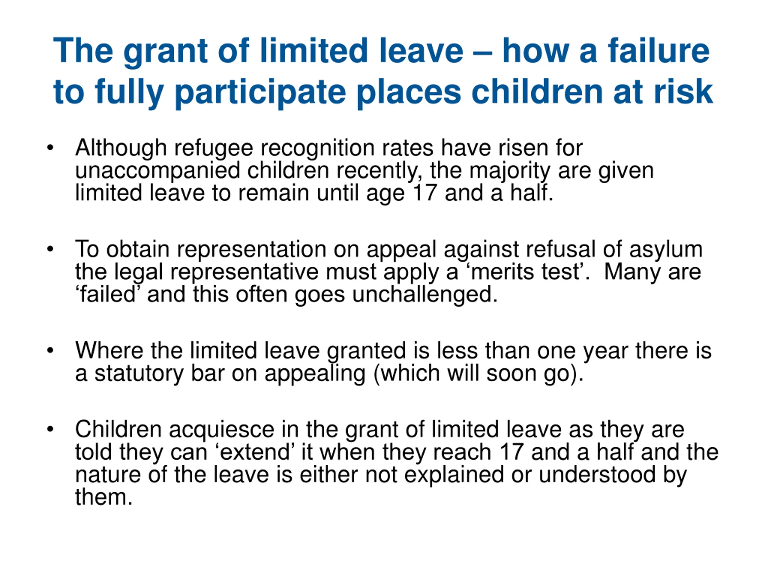 The grant of limited leave how a failure to fully participate places children at risk Although refugee recognition rates have risen for unaccompanied children recently, the majority are given limited leave to remain until age 17 and a half. To obtain representation on appeal against refusal of asylum the legal representative must apply a merits test . Many are failed and this often goes unchallenged. Where the limited leave granted is less than one year there is a statutory bar on appealing (which will soon go). Children acquiesce in the grant of limited leave as they are told they can extend it when they reach 17 and a half and the nature of the leave is either not explained or understood by them.