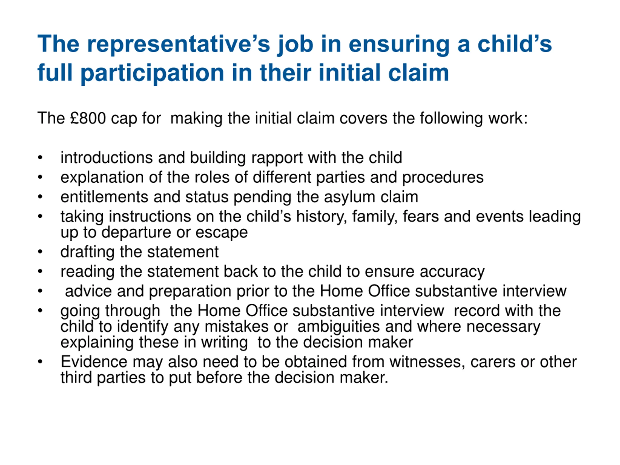 The representatives job in ensuring a childs full participation in their initial claim The 800 cap for making the initial claim covers the following work: introductions and building rapport with the child explanation of the roles of different parties and procedures entitlements and status pending the asylum claim taking instructions on the child s history, family, fears and events leading up to departure or escape drafting the statement reading the statement back to the child to ensure accuracy advice and preparation prior to the Home Office substantive interview going through the Home Office substantive interview record with the child to identify any mistakes or ambiguities and where necessary explaining these in writing to the decision maker Evidence may also need to be obtained from witnesses, carers or other third parties to put before the decision maker.
