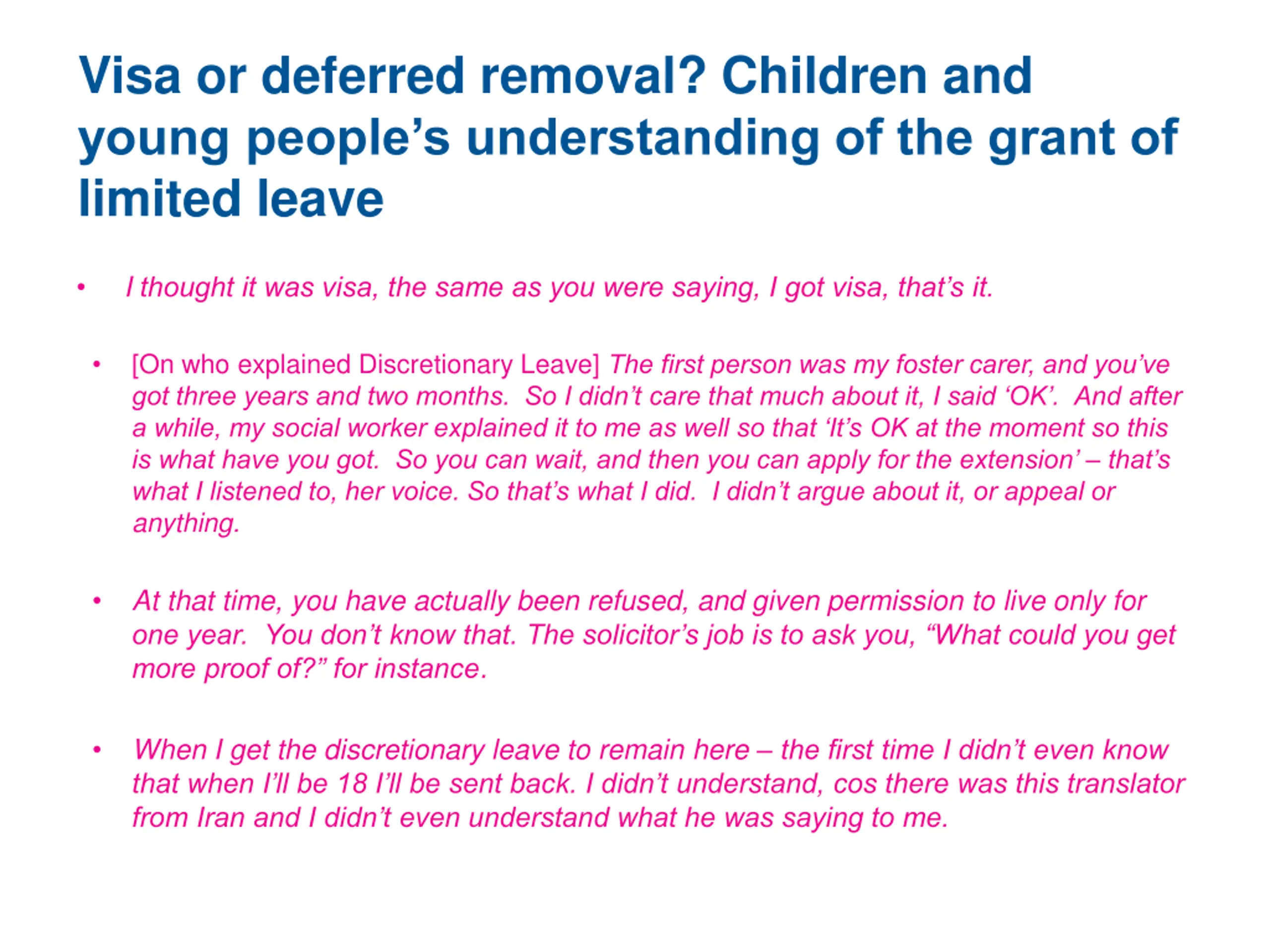Visa or deferred removal? Children and young people s understanding of the grant of limited leave I thought it was visa, the same as you were saying, I got visa, that s it. [On who explained Discretionary Leave] The first person was my foster carer, and you ve got three years and two months. So I didn t care that much about it, I said OK . And after a while, my social worker explained it to me as well so that It s OK at the moment so this is what have you got. So you can wait, and then you can apply for the extension that s what I listened to, her voice. So that s what I did. I didn t argue about it, or appeal or anything. At that time, you have actually been refused, and given permission to live only for one year. You don t know that. The solicitor s job is to ask you, What could you get more proof of? for instance. When I get the discretionary leave to remain here the first time I didn t even know that when I ll be 18 I ll be sent back. I didn t understand, cos there was this translator from Iran and I didn t even understand what he was saying to me.