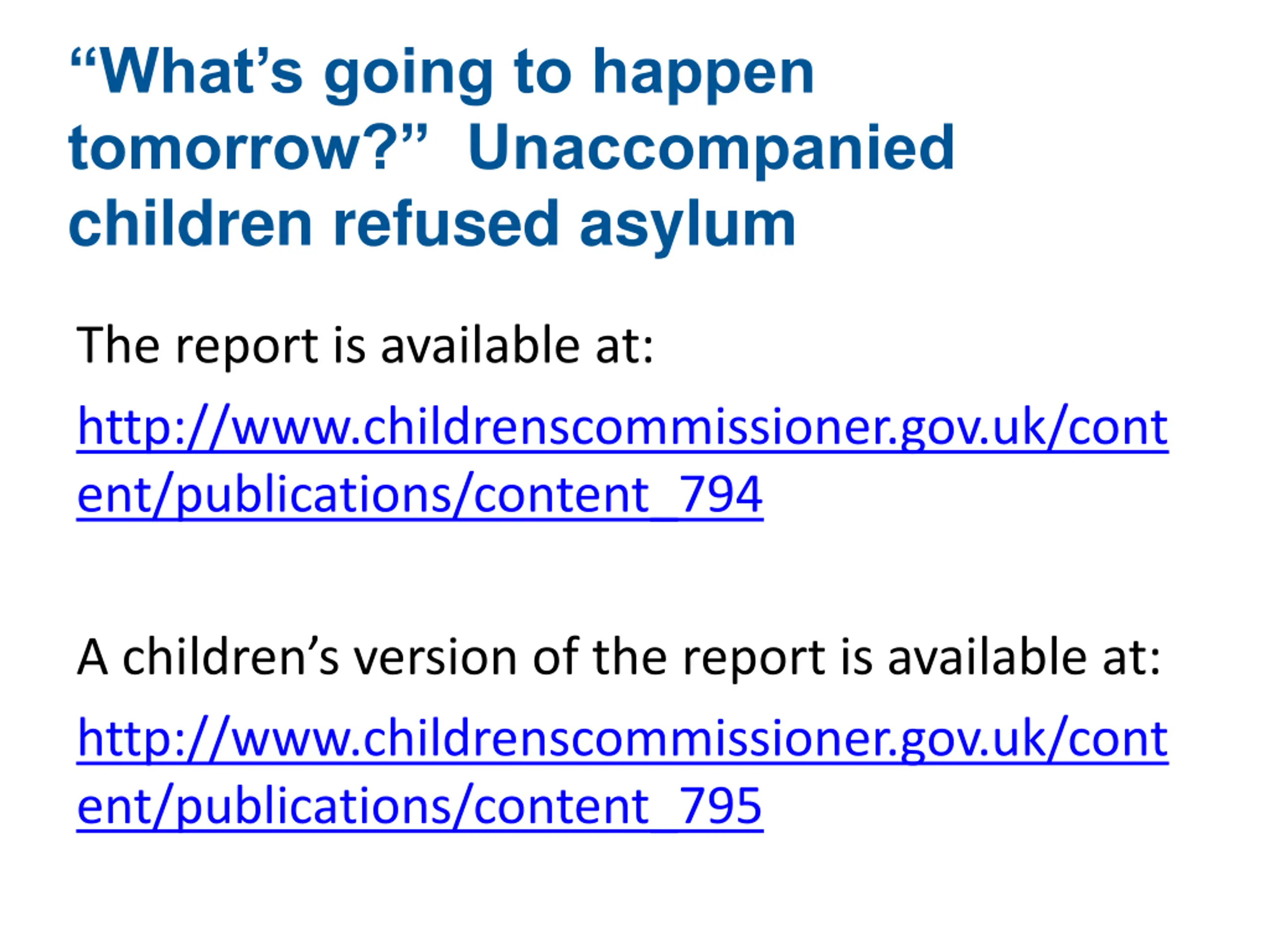 Whats going to happen tomorrow? Unaccompanied children refused asylum The report is available at: http://www.childrenscommissioner.gov.uk/cont ent/publications/content_794 A children s version of the report is available at: http://www.childrenscommissioner.gov.uk/cont ent/publications/content_795