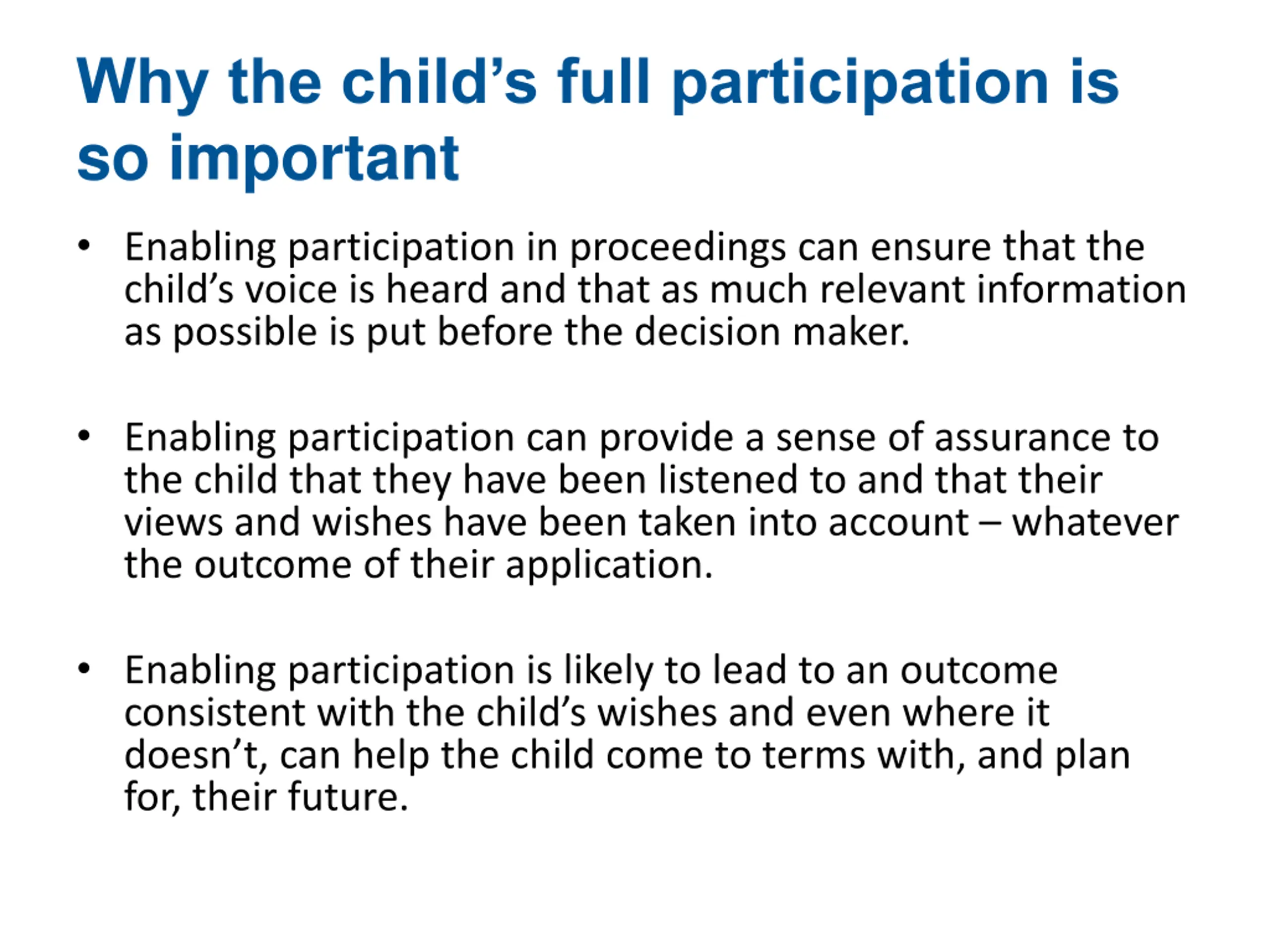 Why the childs full participation is so important Enabling participation in proceedings can ensure that the child s voice is heard and that as much relevant information as possible is put before the decision maker. Enabling participation can provide a sense of assurance to the child that they have been listened to and that their views and wishes have been taken into account whatever the outcome of their application. Enabling participation is likely to lead to an outcome consistent with the child s wishes and even where it doesn t, can help the child come to terms with, and plan for, their future.