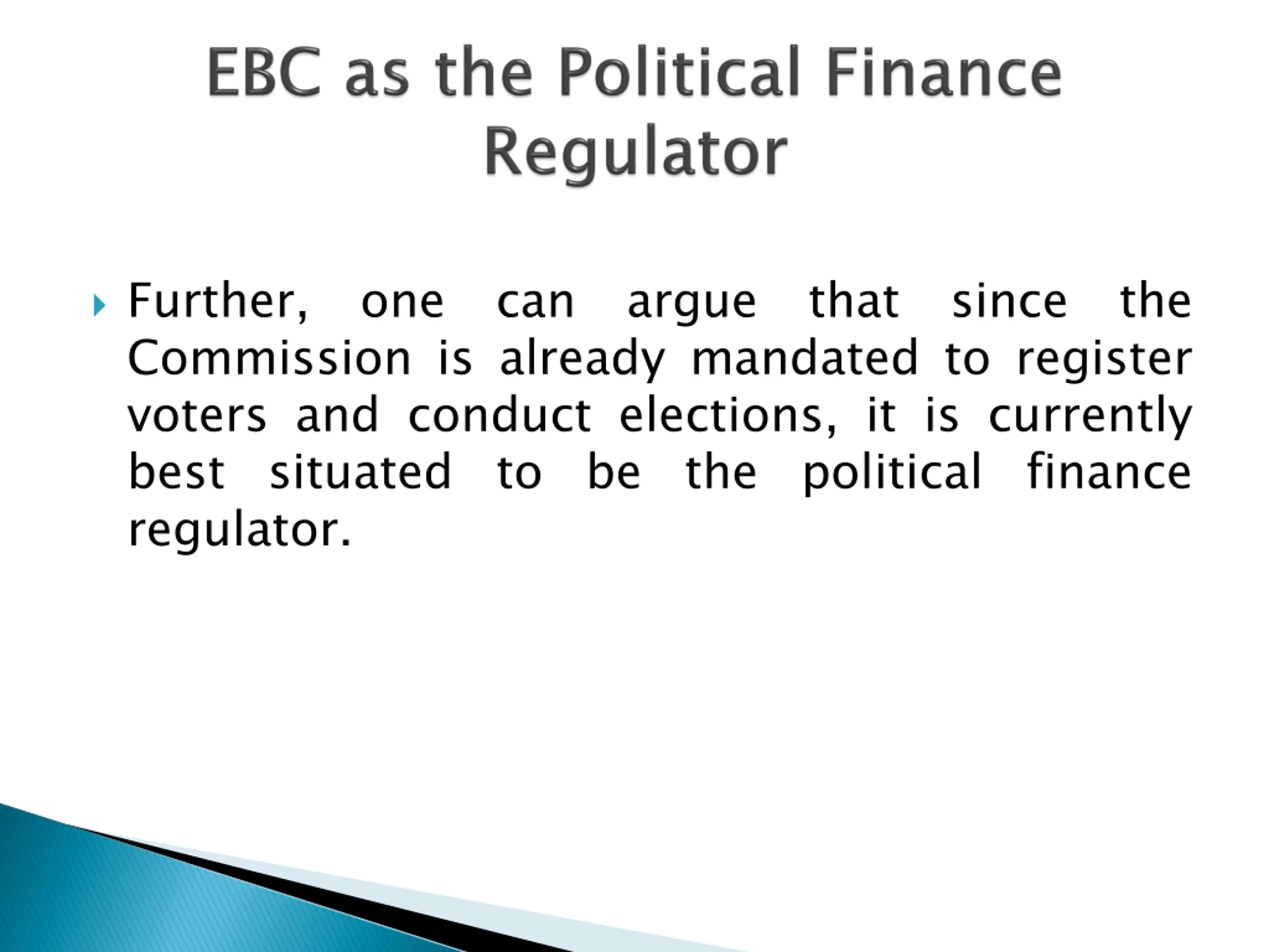 Further, Commission is already mandated to register voters and conduct elections, it is currently best situated to be the political finance regulator. one can argue that since the