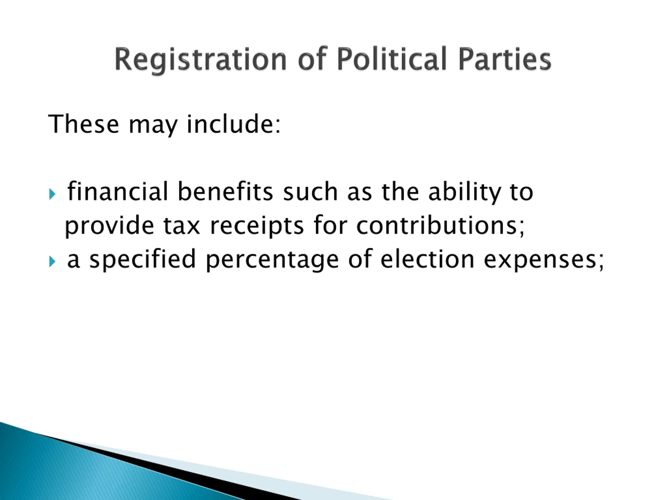 These may include: financial benefits such as the ability to provide tax receipts for contributions; a specified percentage of election expenses;