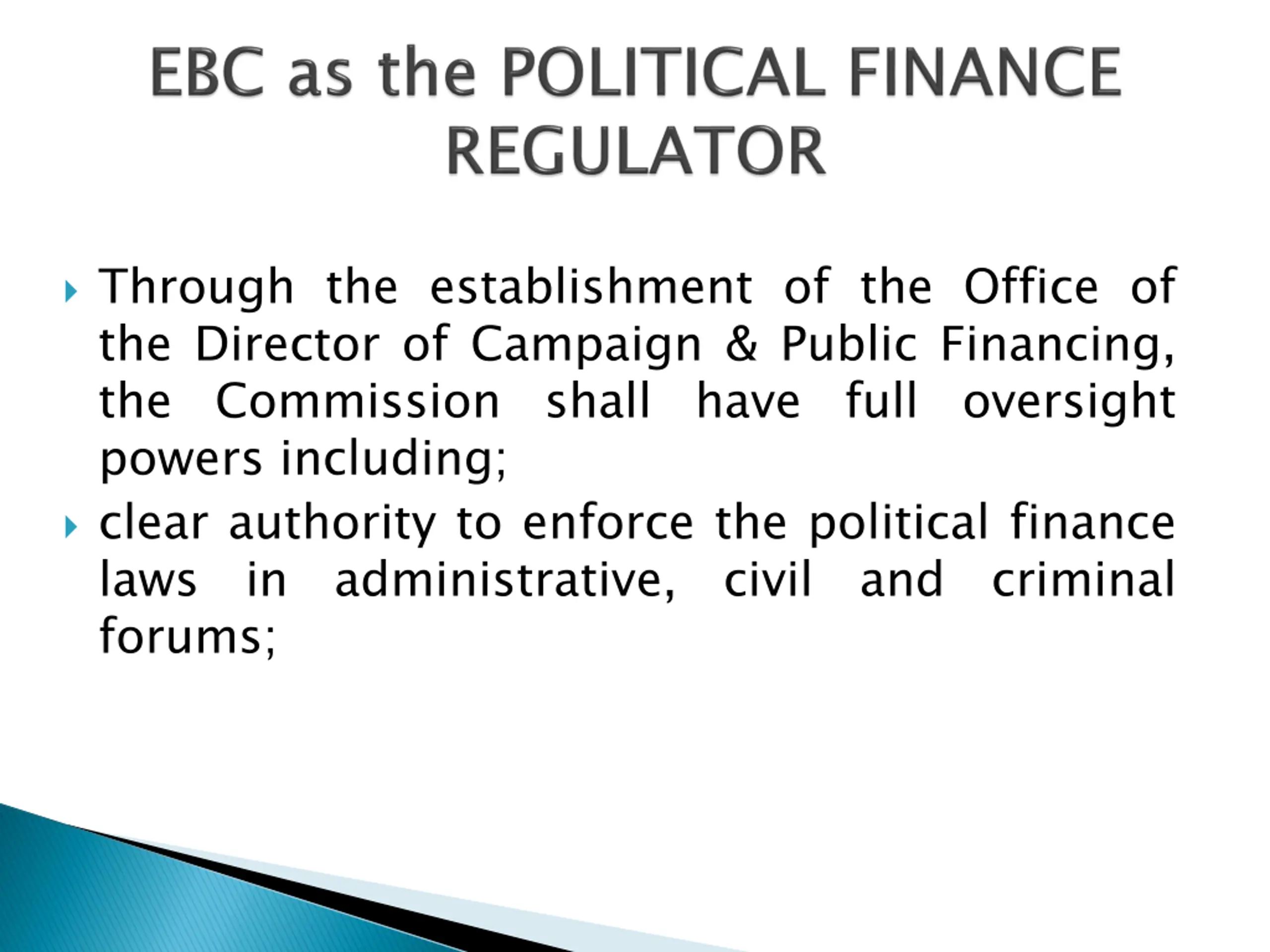 Through the establishment of the Office of the Director of Campaign & Public Financing, the powers including; clear authority to enforce the political finance laws forums; Commission shall have full oversight in administrative, civil and criminal