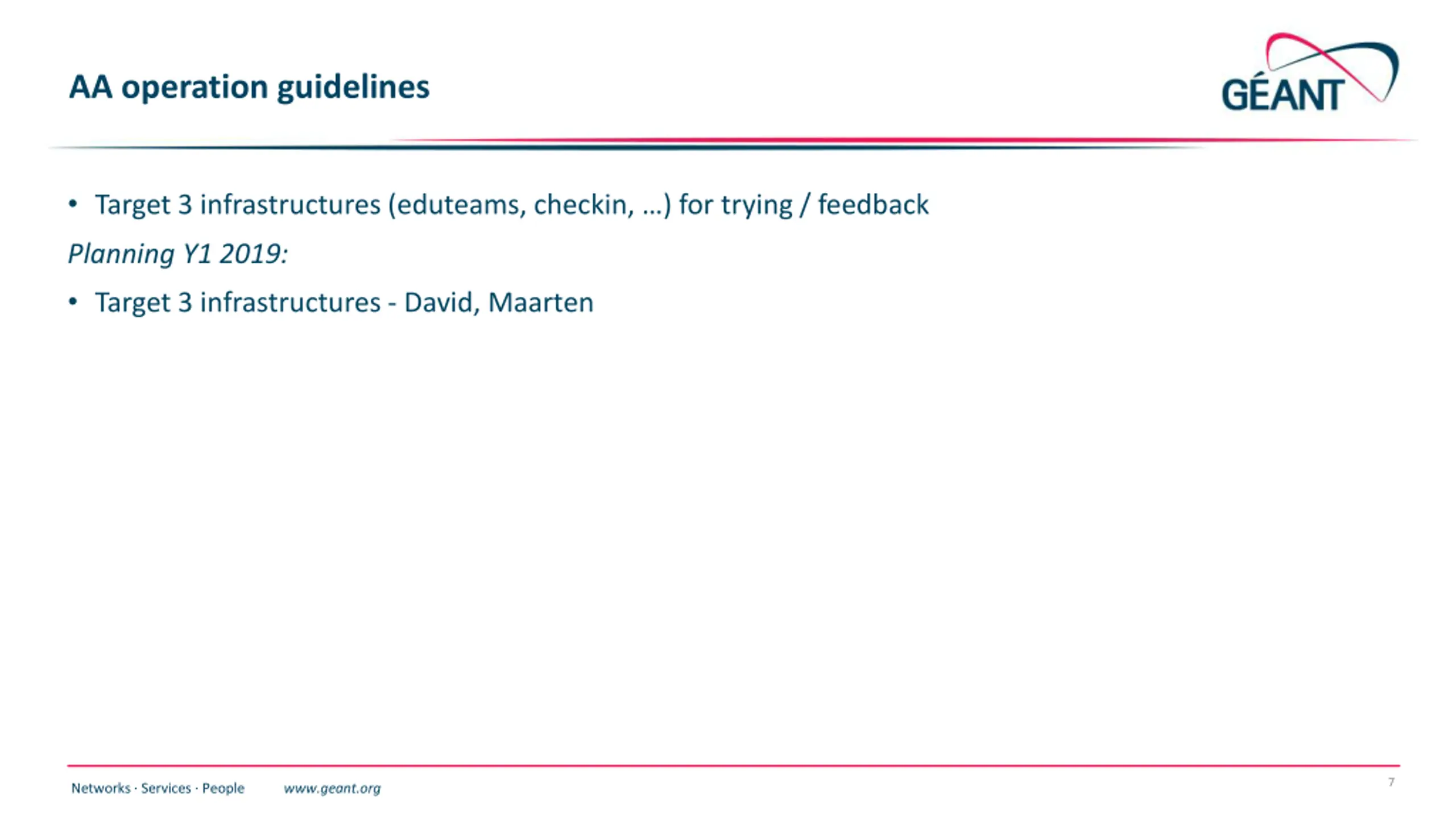 AA operation guidelines Target 3 infrastructures (eduteams, checkin, ) for trying / feedback Planning Y1 2019: Target 3 infrastructures - David, Maarten 7 Networks Services People www.geant.org