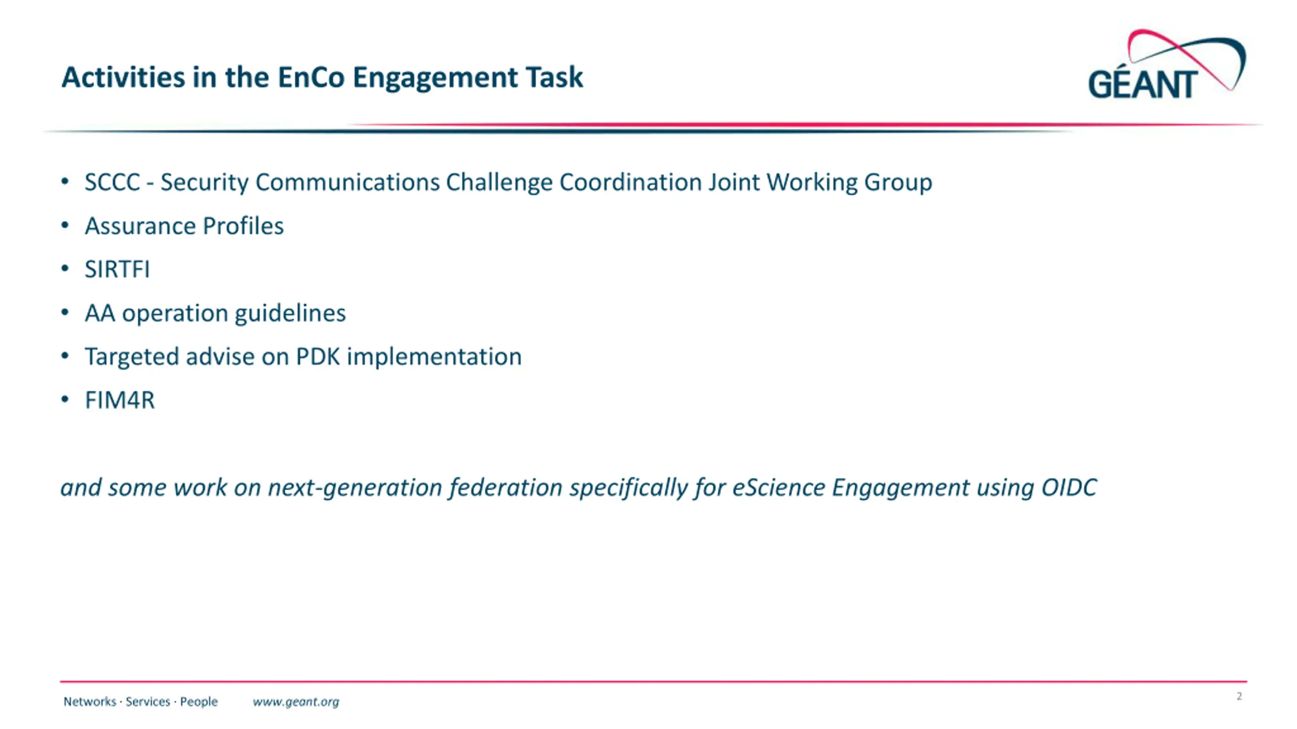 Activities in the EnCo Engagement Task SCCC - Security Communications Challenge Coordination Joint Working Group Assurance Profiles SIRTFI AA operation guidelines Targeted advise on PDK implementation FIM4R and some work on next-generation federation specifically for eScience Engagement using OIDC 2 Networks Services People www.geant.org