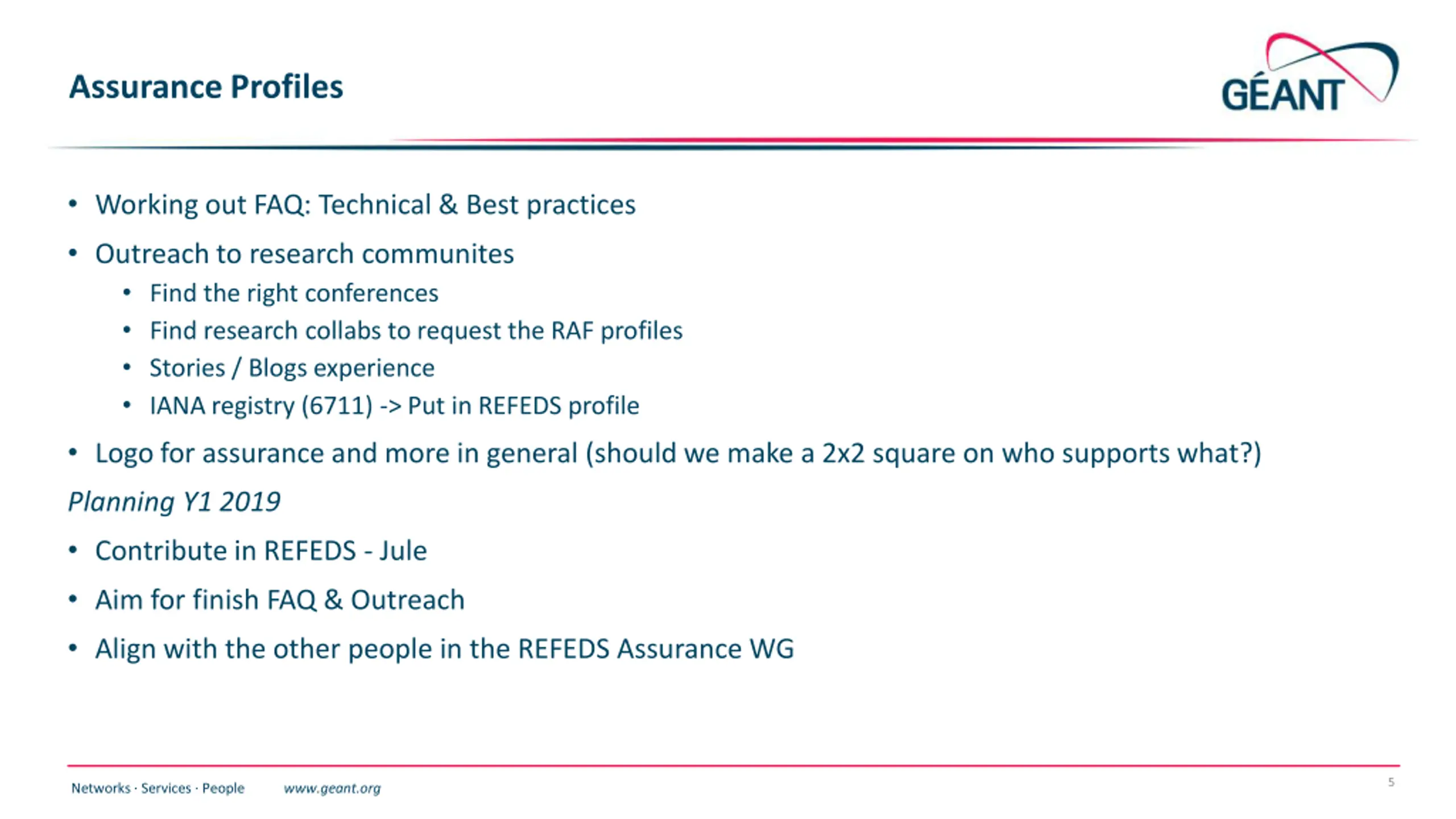 Assurance Profiles Working out FAQ: Technical & Best practices Outreach to research communites Find the right conferences Find research collabs to request the RAF profiles Stories / Blogs experience IANA registry (6711) -> Put in REFEDS profile Logo for assurance and more in general (should we make a 2x2 square on who supports what?) Planning Y1 2019 Contribute in REFEDS - Jule Aim for finish FAQ & Outreach Align with the other people in the REFEDS Assurance WG 5 Networks Services People www.geant.org