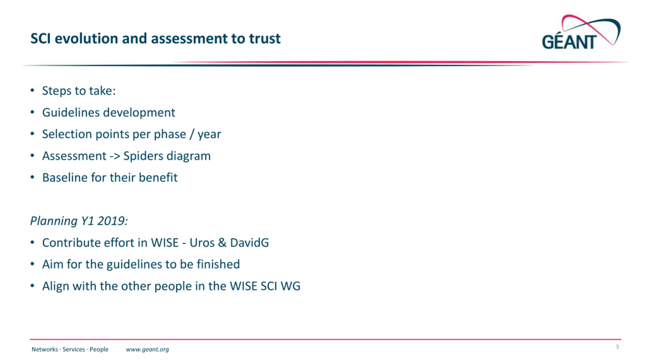 SCI evolution and assessment to trust Steps to take: Guidelines development Selection points per phase / year Assessment -> Spiders diagram Baseline for their benefit Planning Y1 2019: Contribute effort in WISE - Uros & DavidG Aim for the guidelines to be finished Align with the other people in the WISE SCI WG 3 Networks Services People www.geant.org