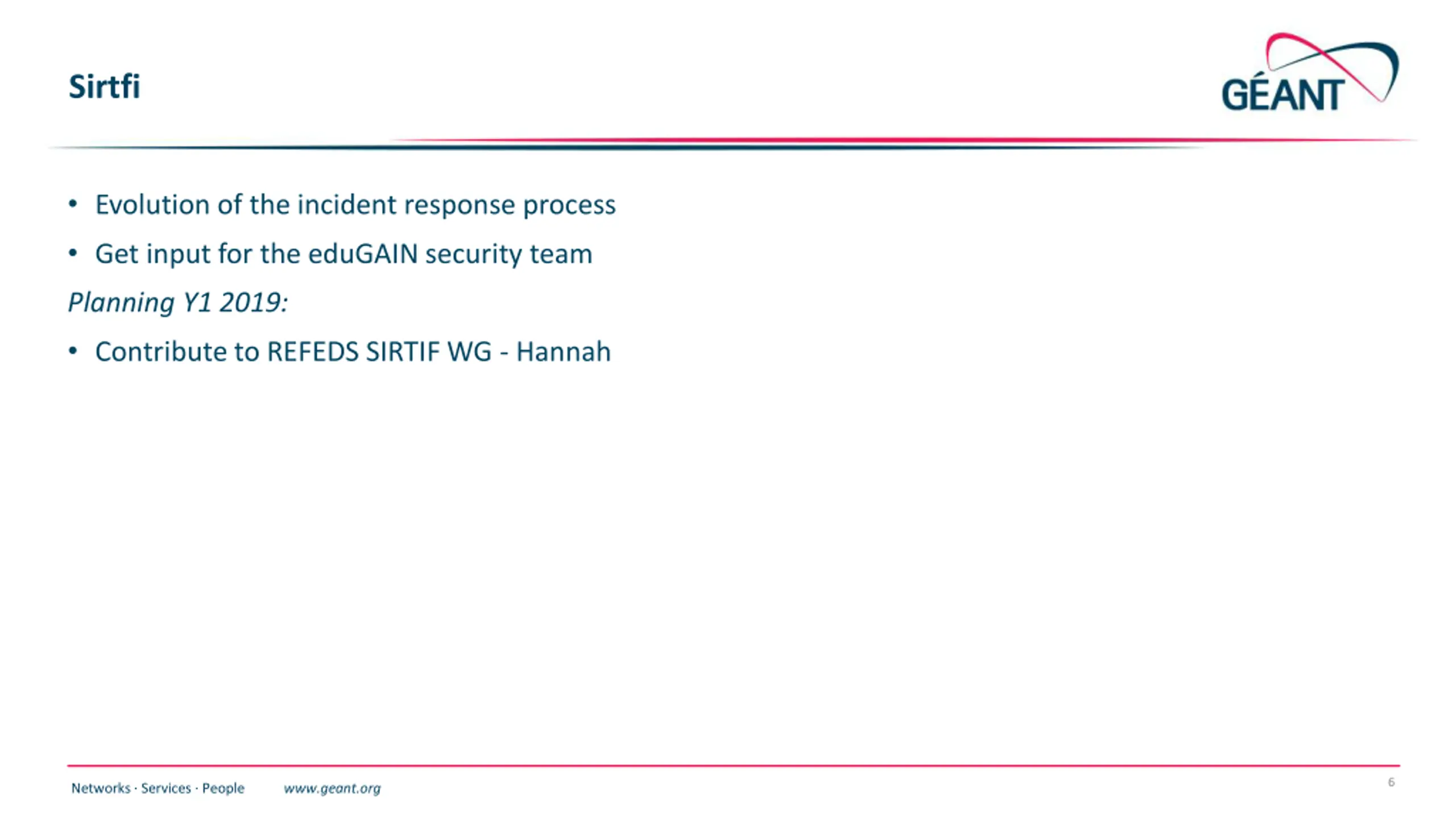 Sirtfi Evolution of the incident response process Get input for the eduGAIN security team Planning Y1 2019: Contribute to REFEDS SIRTIF WG - Hannah 6 Networks Services People www.geant.org