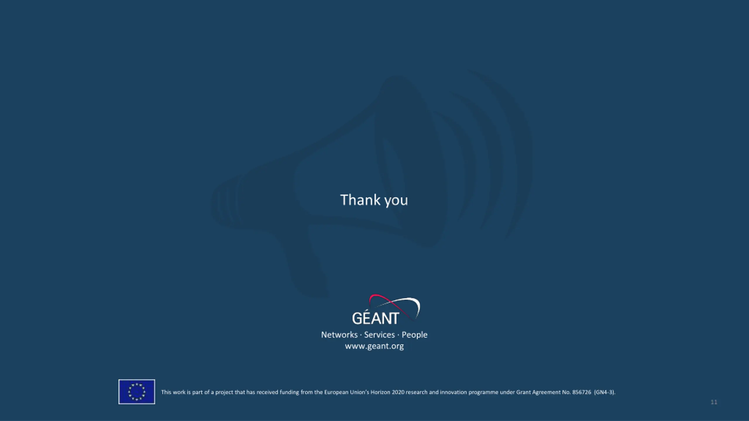 Thank you Networks Services People www.geant.org This work is part of a project that has received funding from the European Union s Horizon 2020 research and innovation programme under Grant Agreement No. 856726 (GN4-3). 11 Networks Services People www.geant.org