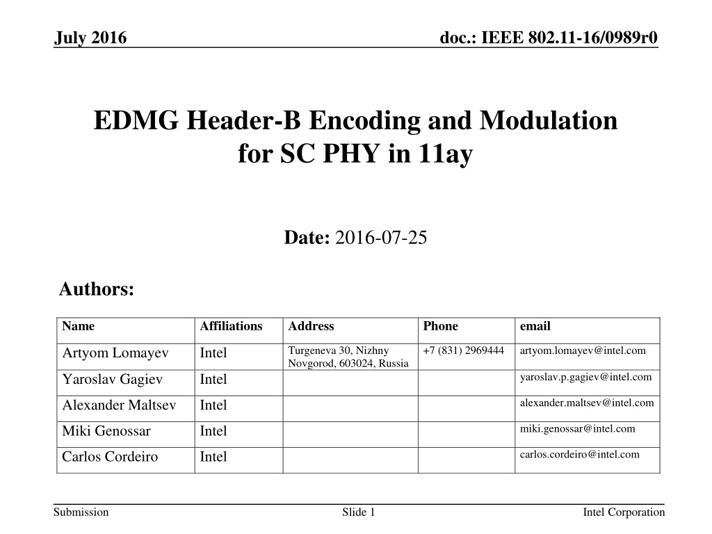 July 2016 doc.: IEEE 802.11-16/0989r0 EDMG Header-B Encoding and Modulation for SC PHY in 11ay Date: 2016-07-25 Authors: Name Affiliations Address Phone email +7 (831) 2969444 Turgeneva 30, Nizhny Novgorod, 603024, Russia artyom.lomayev@intel.com Artyom Lomayev Intel yaroslav.p.gagiev@intel.com Yaroslav Gagiev Intel alexander.maltsev@intel.com Alexander Maltsev Intel miki.genossar@intel.com Miki Genossar Intel carlos.cordeiro@intel.com Carlos Cordeiro Intel Submission Slide 1 Intel Corporation