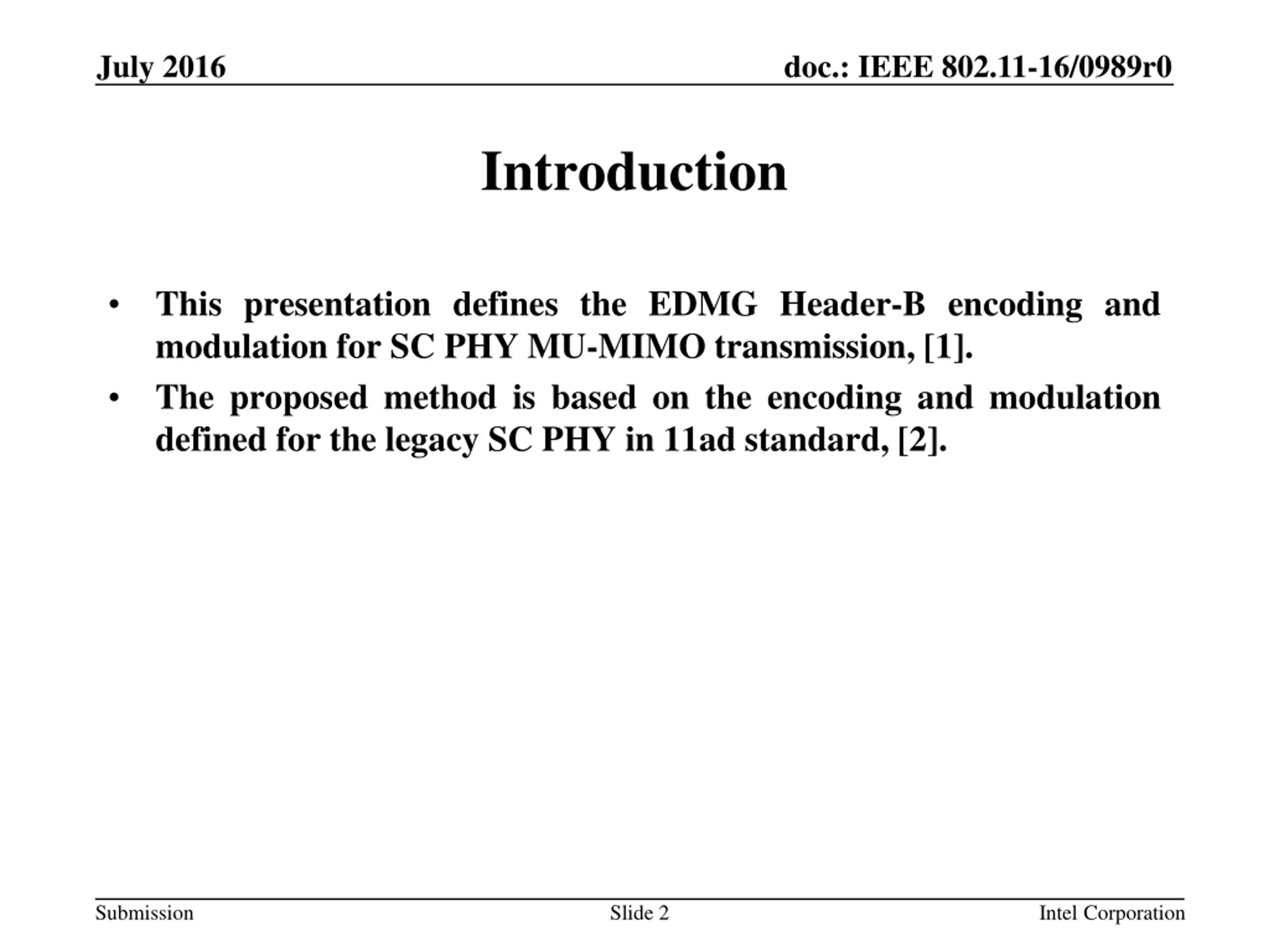 July 2016 doc.: IEEE 802.11-16/0989r0 Introduction This presentation defines the EDMG Header-B encoding and modulation for SC PHY MU-MIMO transmission, [1]. The proposed method is based on the encoding and modulation defined for the legacy SC PHY in 11ad standard, [2]. Submission Slide 2 Intel Corporation