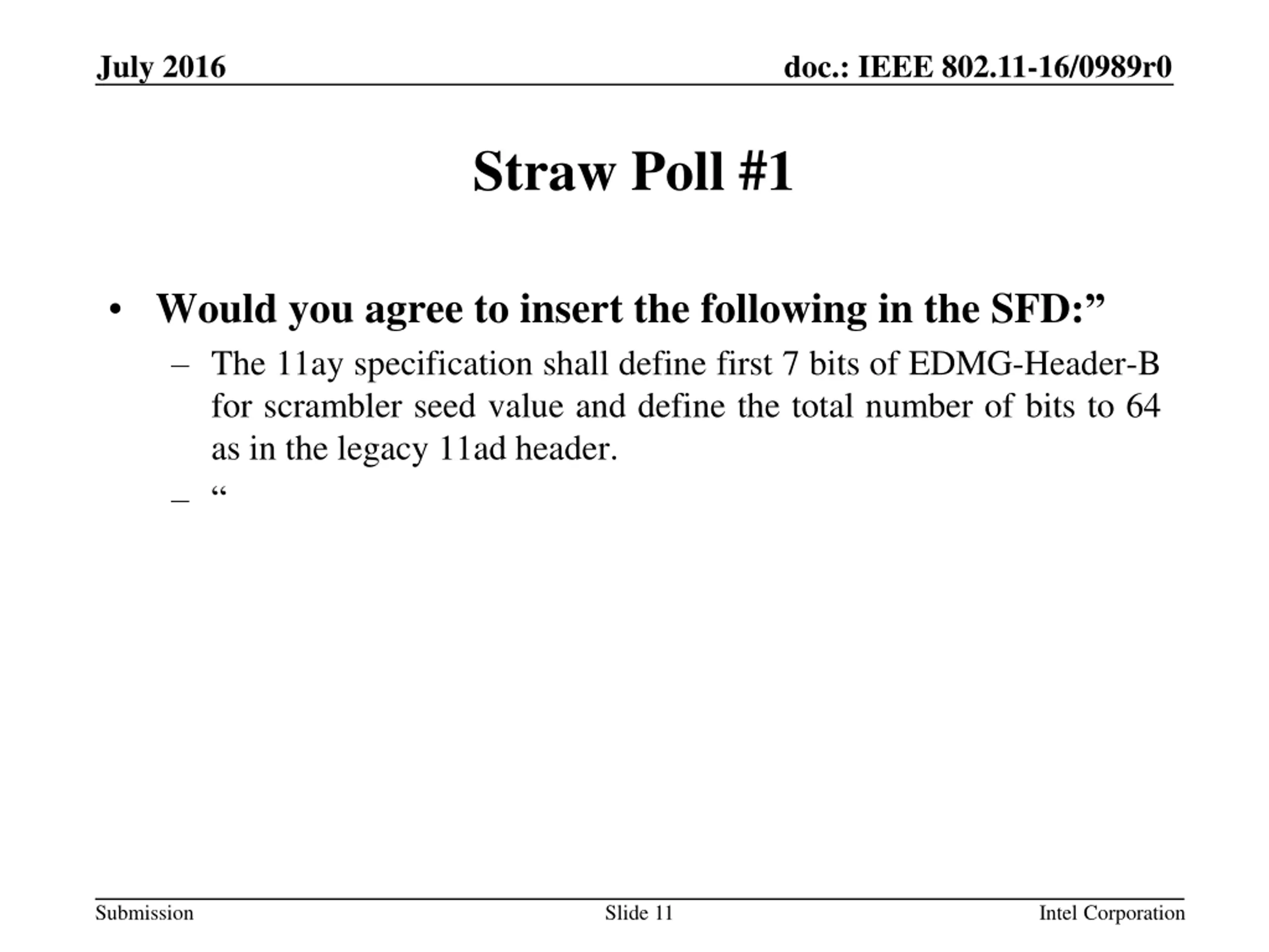 July 2016 doc.: IEEE 802.11-16/0989r0 Straw Poll #1 Would you agree to insert the following in the SFD: The 11ay specification shall define first 7 bits of EDMG-Header-B for scrambler seed value and define the total number of bits to 64 as in the legacy 11ad header. Submission Slide 11 Intel Corporation