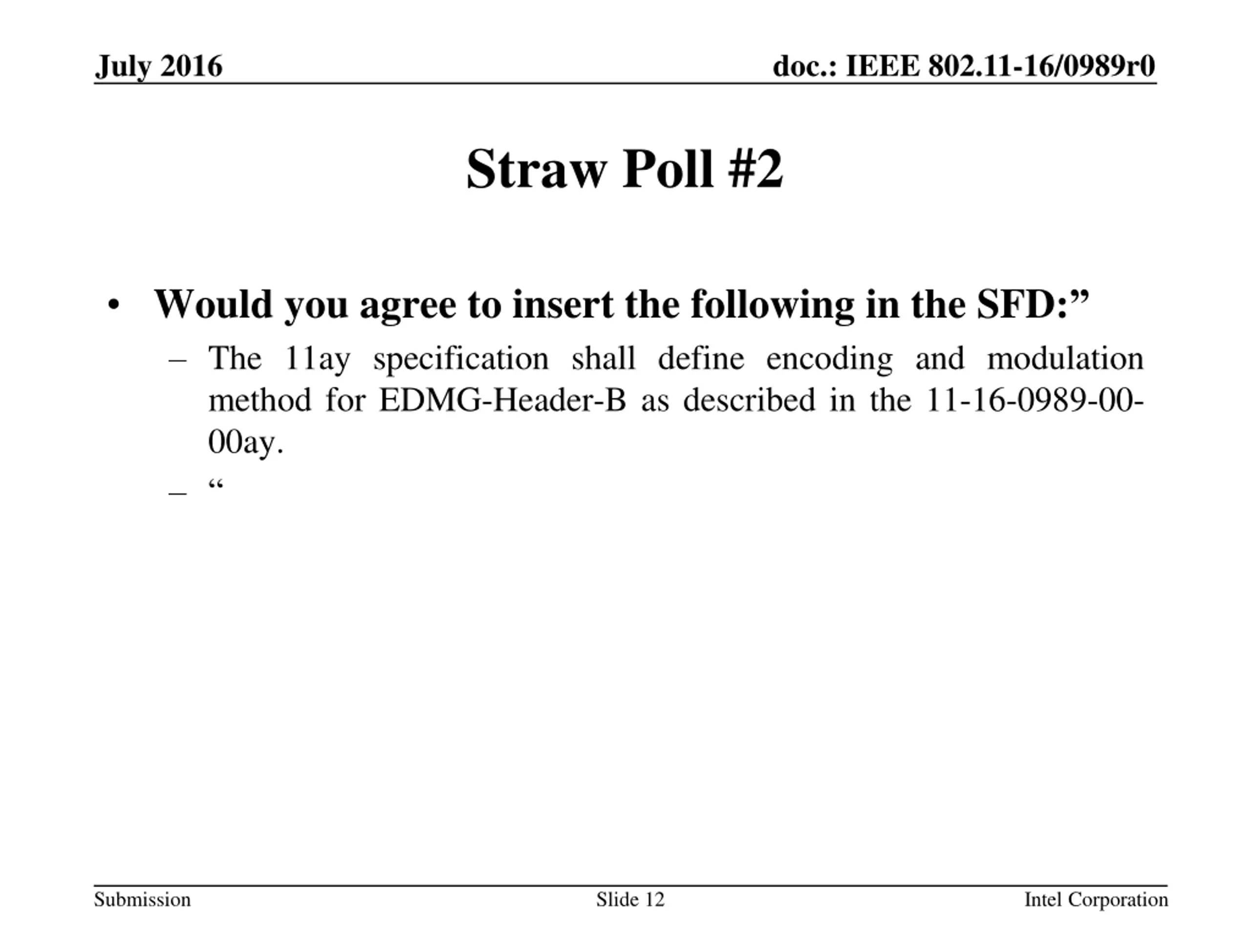 July 2016 doc.: IEEE 802.11-16/0989r0 Straw Poll #2 Would you agree to insert the following in the SFD: The 11ay specification shall define encoding and modulation method for EDMG-Header-B as described in the 11-16-0989-00- 00ay. Submission Slide 12 Intel Corporation