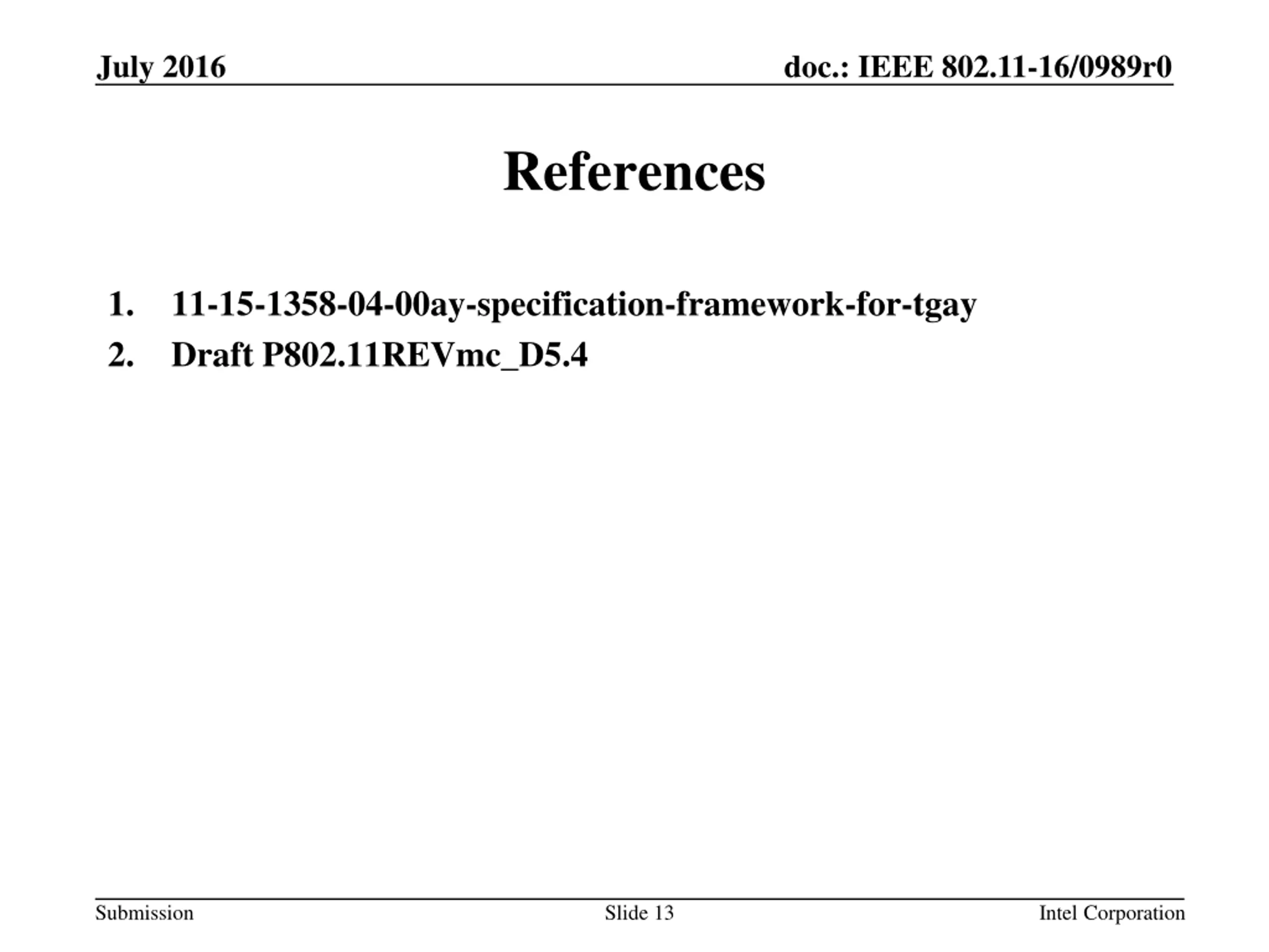 July 2016 doc.: IEEE 802.11-16/0989r0 References 1. 2. 11-15-1358-04-00ay-specification-framework-for-tgay Draft P802.11REVmc_D5.4 Submission Slide 13 Intel Corporation