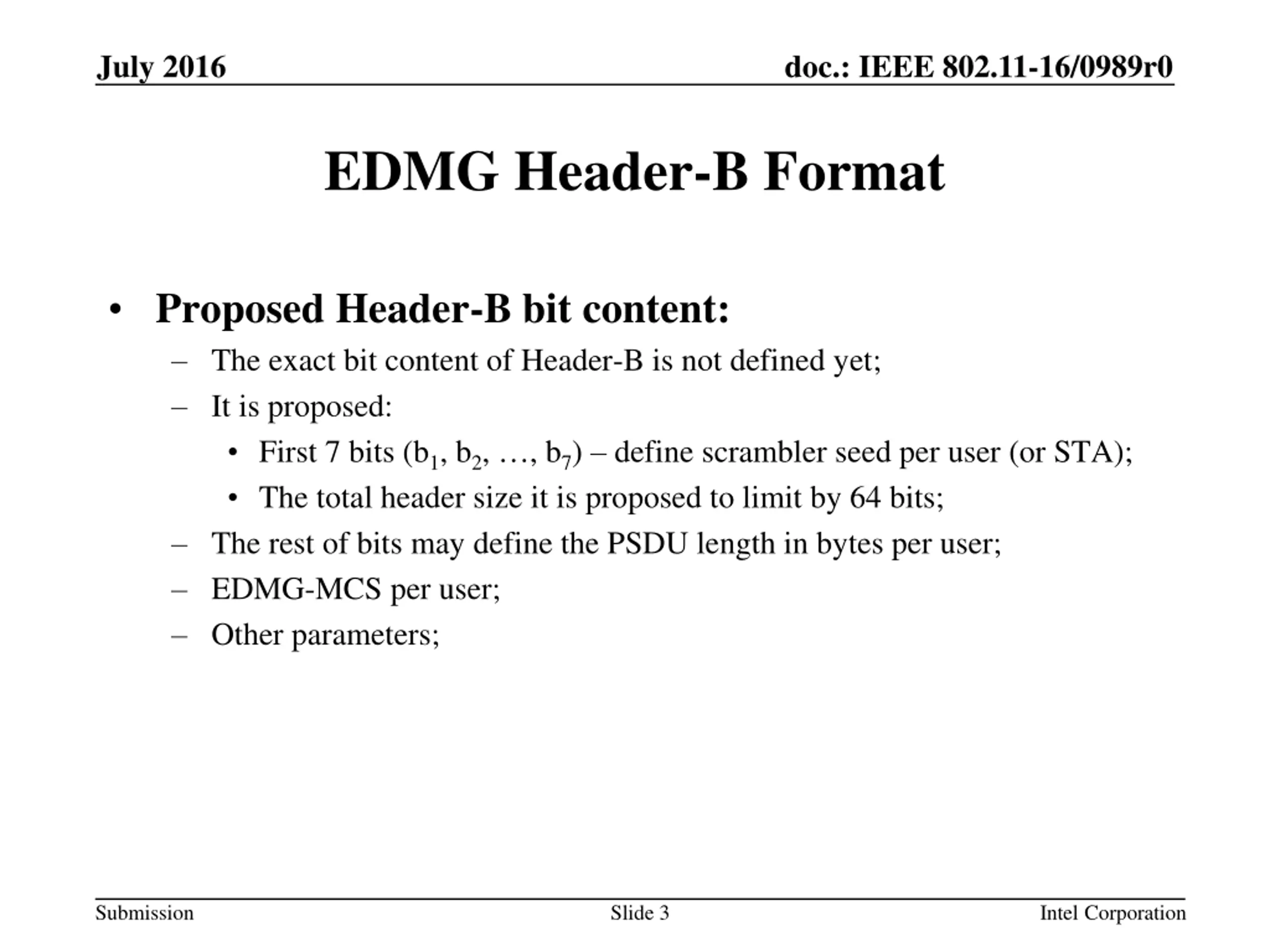 July 2016 doc.: IEEE 802.11-16/0989r0 EDMG Header-B Format Proposed Header-B bit content: The exact bit content of Header-B is not defined yet; It is proposed: First 7 bits (b1, b2, , b7) define scrambler seed per user (or STA); The total header size it is proposed to limit by 64 bits; The rest of bits may define the PSDU length in bytes per user; EDMG-MCS per user; Other parameters; Submission Slide 3 Intel Corporation