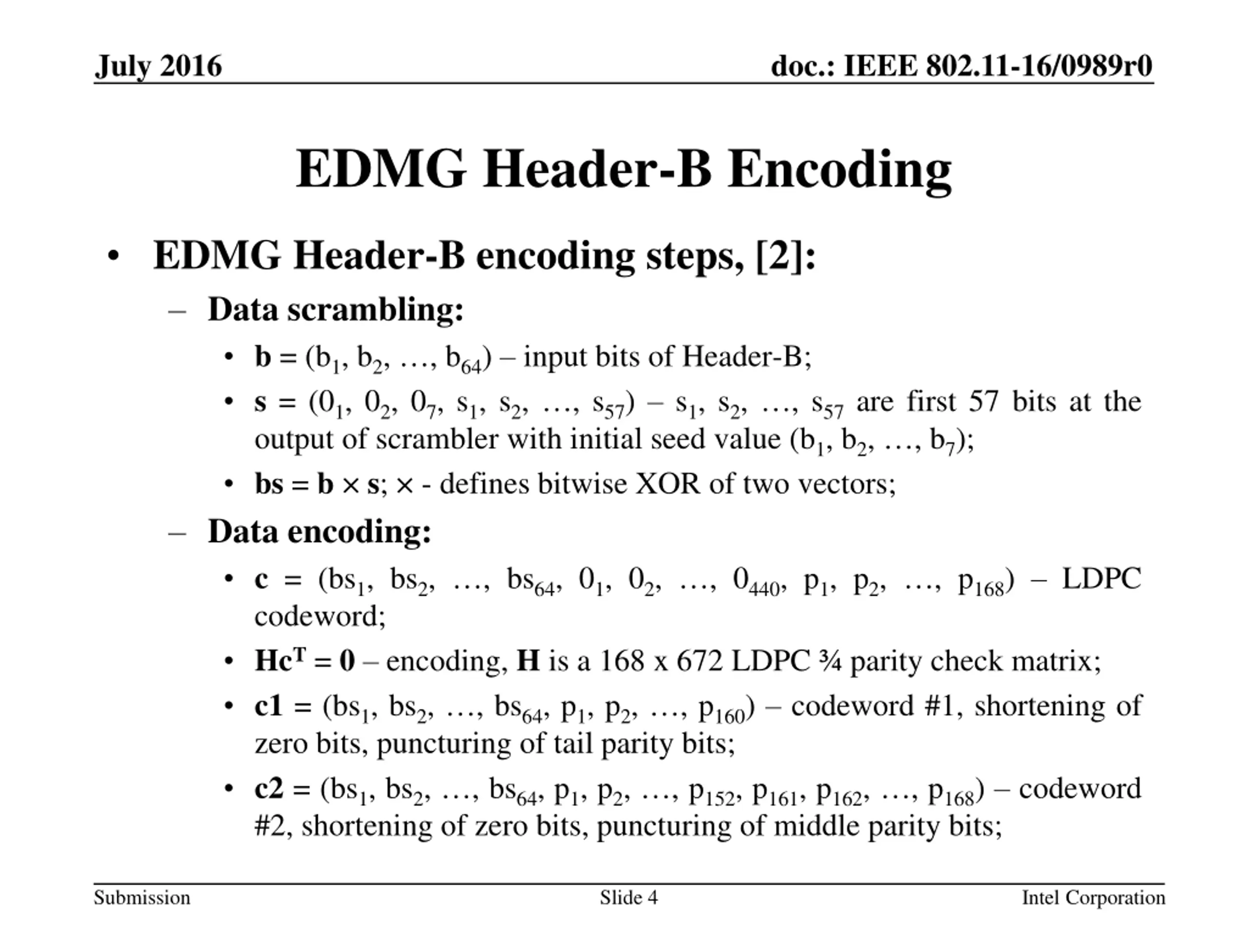 July 2016 doc.: IEEE 802.11-16/0989r0 EDMG Header-B Encoding EDMG Header-B encoding steps, [2]: Data scrambling: b = (b1, b2, , b64) input bits of Header-B; s = (01, 02, 07, s1, s2, , s57) s1, s2, , s57 are first 57 bits at the output of scrambler with initial seed value (b1, b2, , b7); bs = b s; - defines bitwise XOR of two vectors; Data encoding: c = (bs1, bs2, , bs64, 01, 02, , 0440, p1, p2, , p168) LDPC codeword; HcT = 0 encoding, H is a 168 x 672 LDPC parity check matrix; c1 = (bs1, bs2, , bs64, p1, p2, , p160) codeword #1, shortening of zero bits, puncturing of tail parity bits; c2 = (bs1, bs2, , bs64, p1, p2, , p152, p161, p162, , p168) codeword #2, shortening of zero bits, puncturing of middle parity bits; Submission Slide 4 Intel Corporation