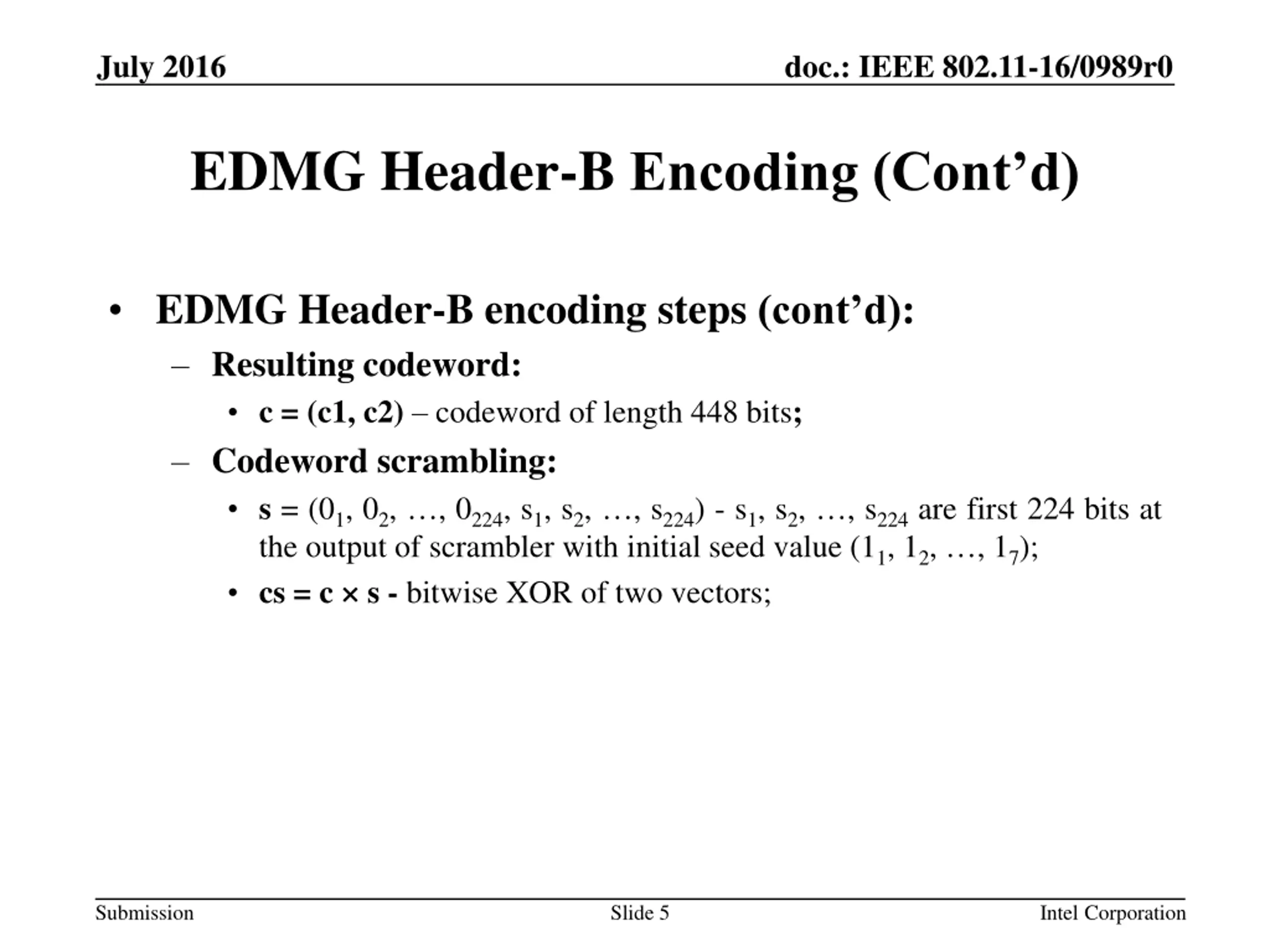 July 2016 doc.: IEEE 802.11-16/0989r0 EDMG Header-B Encoding (Cont d) EDMG Header-B encoding steps (cont d): Resulting codeword: c = (c1, c2) codeword of length 448 bits; Codeword scrambling: s = (01, 02, , 0224, s1, s2, , s224) - s1, s2, , s224 are first 224 bits at the output of scrambler with initial seed value (11, 12, , 17); cs = c s - bitwise XOR of two vectors; Submission Slide 5 Intel Corporation