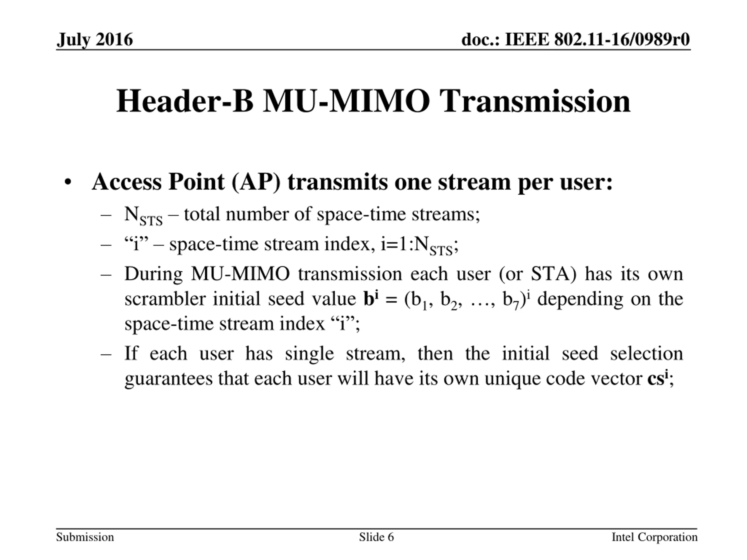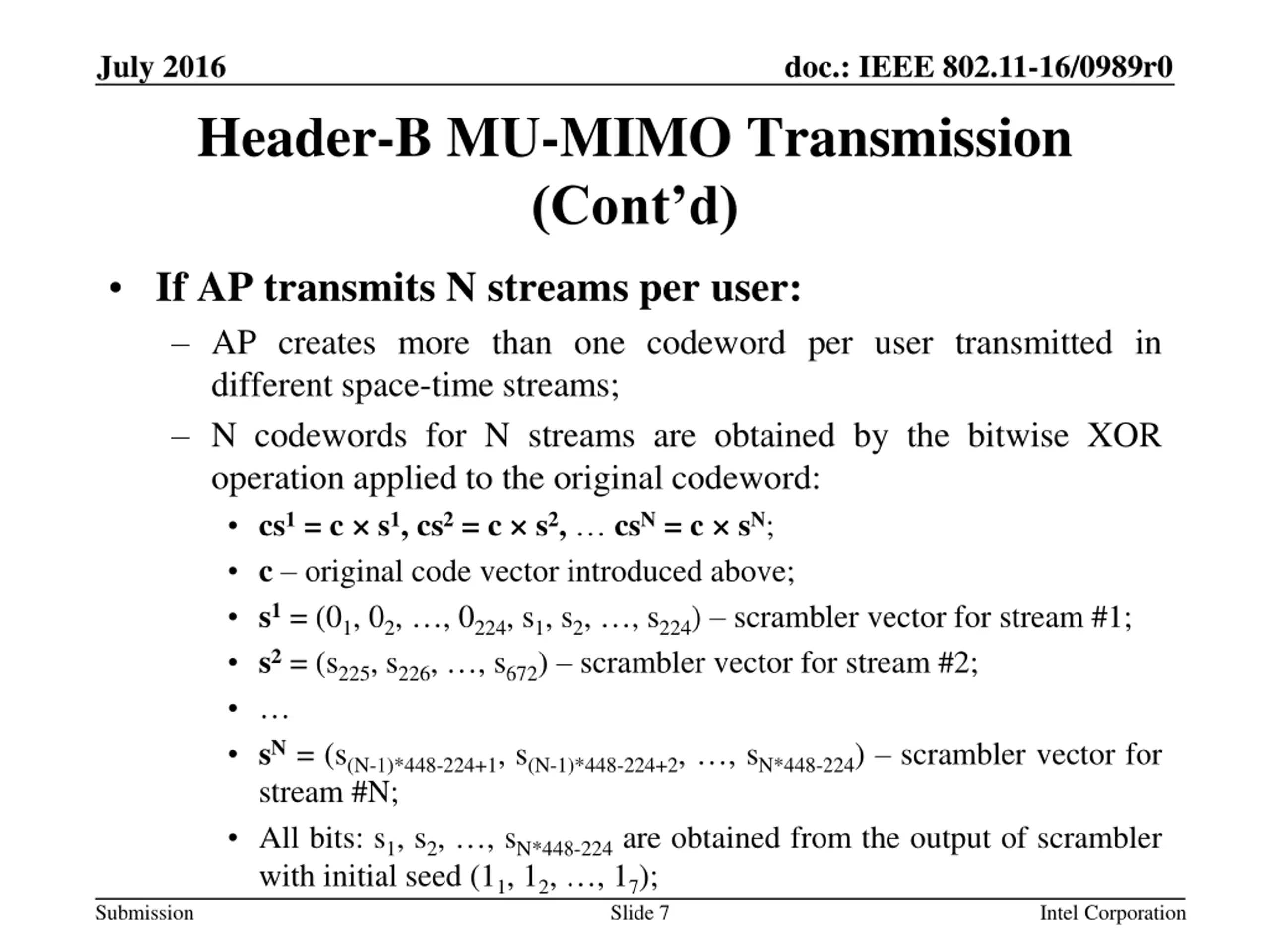 July 2016 doc.: IEEE 802.11-16/0989r0 Header-B MU-MIMO Transmission Access Point (AP) transmits one stream per user: NSTS total number of space-time streams; i space-time stream index, i=1:NSTS; During MU-MIMO transmission each user (or STA) has its own scrambler initial seed value bi = (b1, b2, , b7)i depending on the space-time stream index i ; If each user has single stream, then the initial seed selection guarantees that each user will have its own unique code vector csi; Submission Slide 6 Intel Corporation