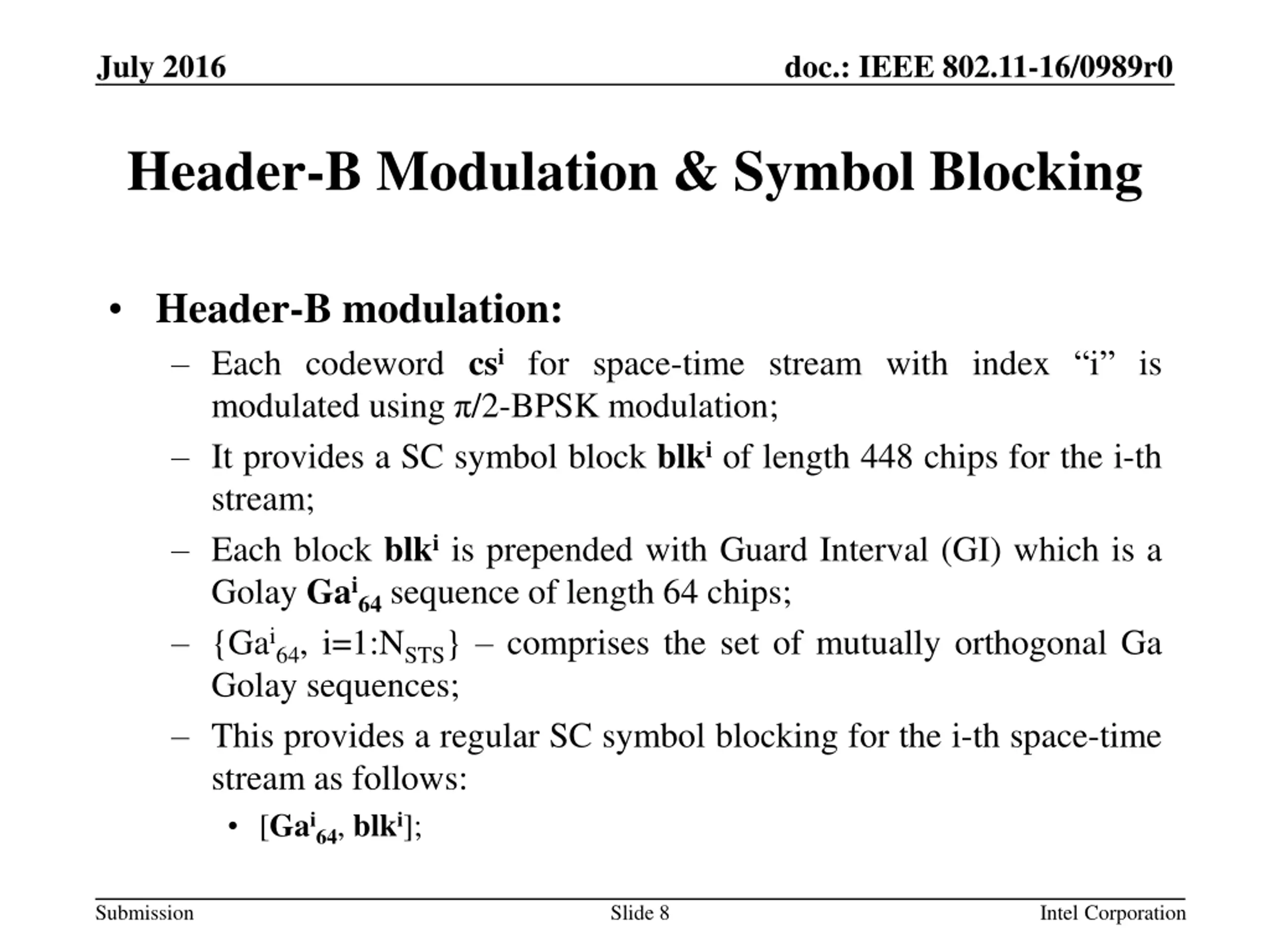 July 2016 doc.: IEEE 802.11-16/0989r0 Header-B Modulation & Symbol Blocking Header-B modulation: Each codeword csi for space-time stream with index i is modulated using /2-BPSK modulation; It provides a SC symbol block blki of length 448 chips for the i-th stream; Each block blki is prepended with Guard Interval (GI) which is a Golay Gai64 sequence of length 64 chips; {Gai64, i=1:NSTS} comprises the set of mutually orthogonal Ga Golay sequences; This provides a regular SC symbol blocking for the i-th space-time stream as follows: [Gai64, blki]; Submission Slide 8 Intel Corporation