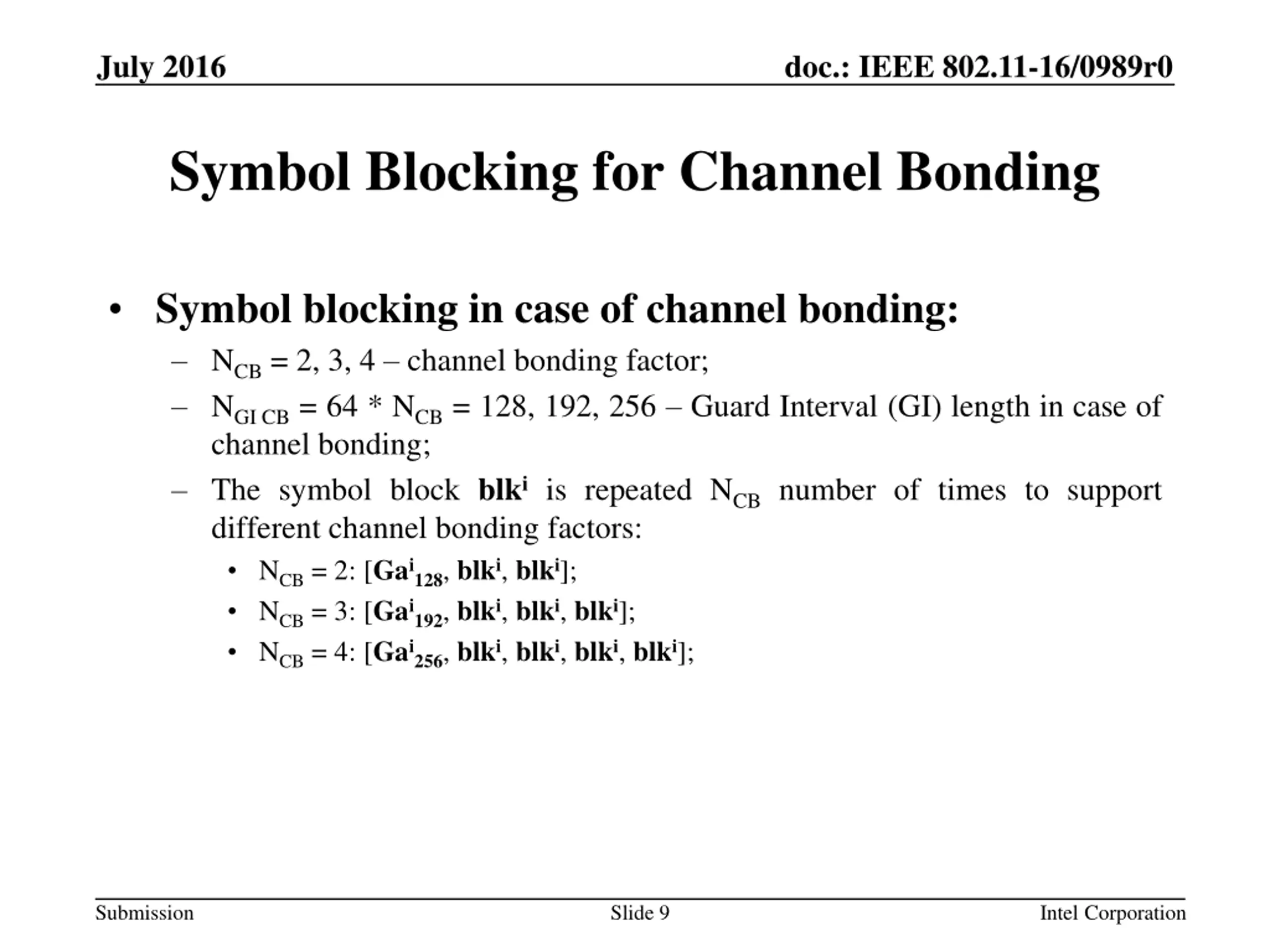July 2016 doc.: IEEE 802.11-16/0989r0 Symbol Blocking for Channel Bonding Symbol blocking in case of channel bonding: NCB = 2, 3, 4 channel bonding factor; NGI CB = 64 * NCB = 128, 192, 256 Guard Interval (GI) length in case of channel bonding; The symbol block blki is repeated NCB number of times to support different channel bonding factors: NCB = 2: [Gai128, blki, blki]; NCB = 3: [Gai192, blki, blki, blki]; NCB = 4: [Gai256, blki, blki, blki, blki]; Submission Slide 9 Intel Corporation