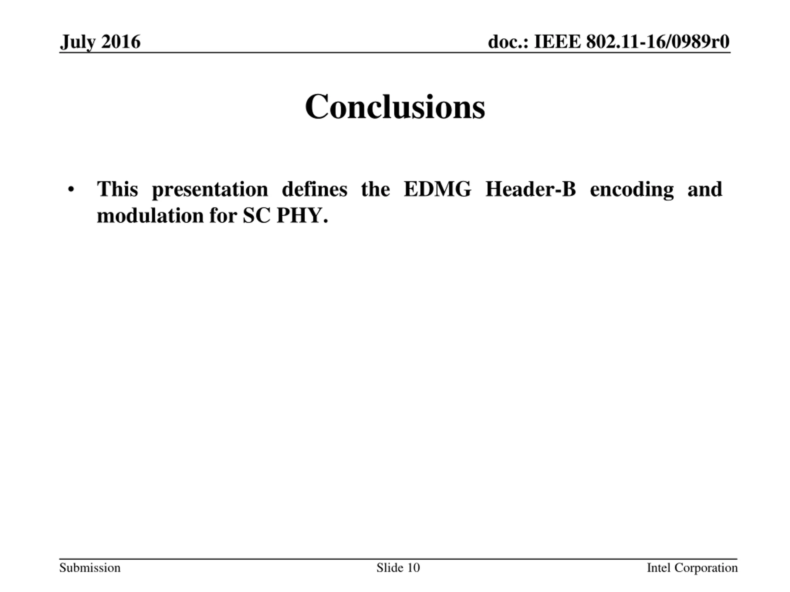 July 2016 doc.: IEEE 802.11-16/0989r0 Conclusions This presentation defines the EDMG Header-B encoding and modulation for SC PHY. Submission Slide 10 Intel Corporation
