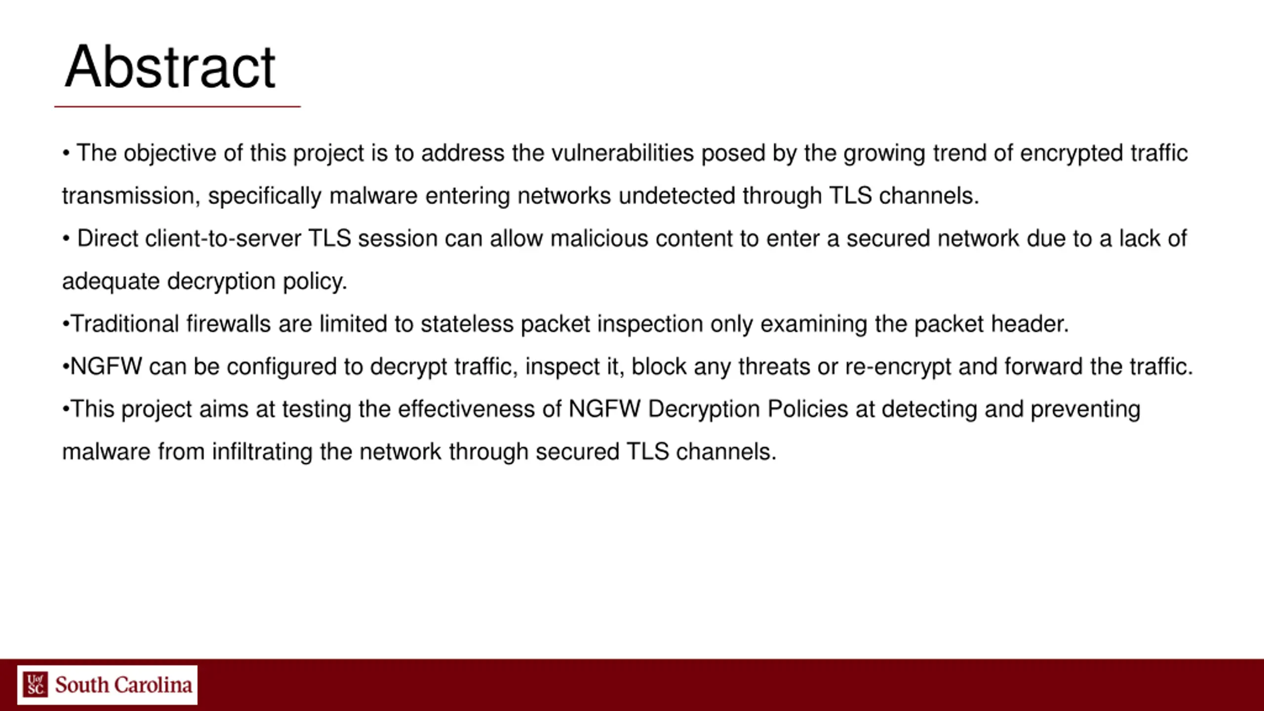 Abstract The objective of this project is to address the vulnerabilities posed by the growing trend of encrypted traffic transmission, specifically malware entering networks undetected through TLS channels. Direct client-to-server TLS session can allow malicious content to enter a secured network due to a lack of adequate decryption policy. Traditional firewalls are limited to stateless packet inspection only examining the packet header. NGFW can be configured to decrypt traffic, inspect it, block any threats or re-encrypt and forward the traffic. This project aims at testing the effectiveness of NGFW Decryption Policies at detecting and preventing malware from infiltrating the network through secured TLS channels. 3