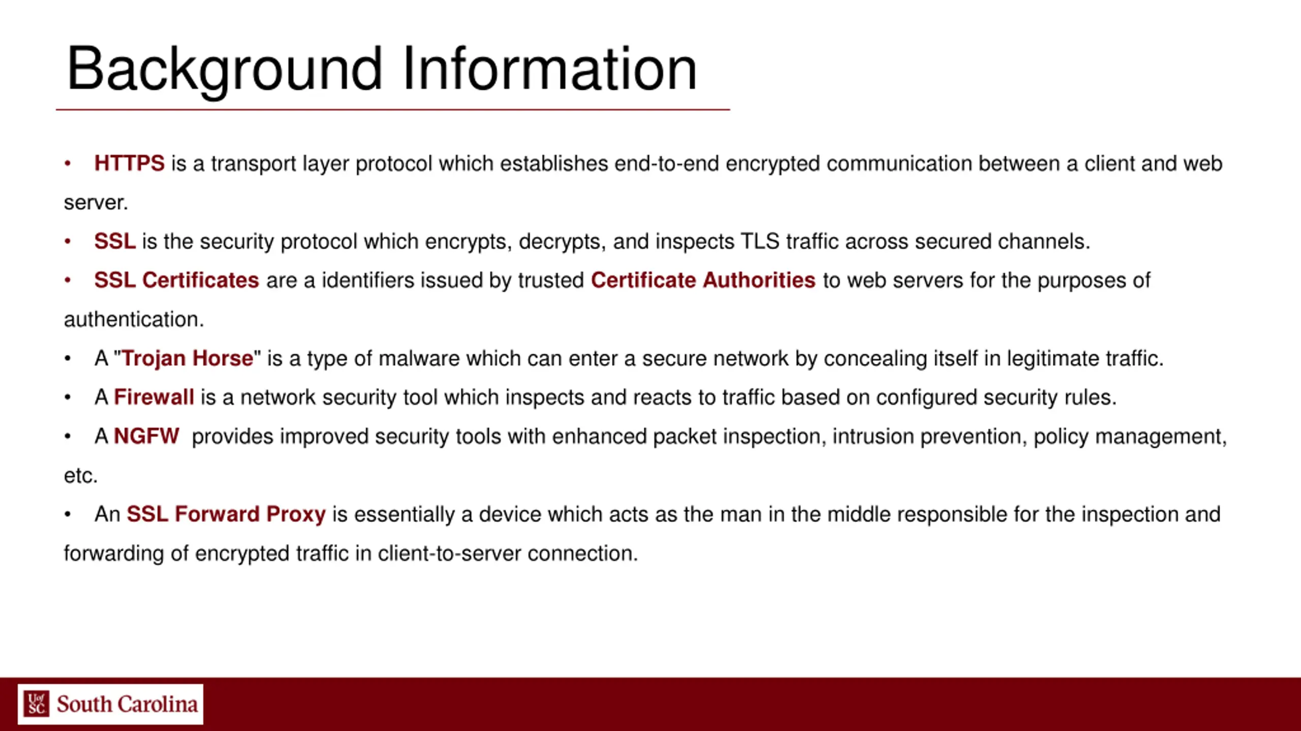 Background Information HTTPS is a transport layer protocol which establishes end-to-end encrypted communication between a client and web server. SSL is the security protocol which encrypts, decrypts, and inspects TLS traffic across secured channels. SSL Certificates are a identifiers issued by trusted Certificate Authorities to web servers for the purposes of authentication. A "Trojan Horse" is a type of malware which can enter a secure network by concealing itself in legitimate traffic. A Firewall is a network security tool which inspects and reacts to traffic based on configured security rules. A NGFW provides improved security tools with enhanced packet inspection, intrusion prevention, policy management, etc. An SSL Forward Proxy is essentially a device which acts as the man in the middle responsible for the inspection and forwarding of encrypted traffic in client-to-server connection. 5