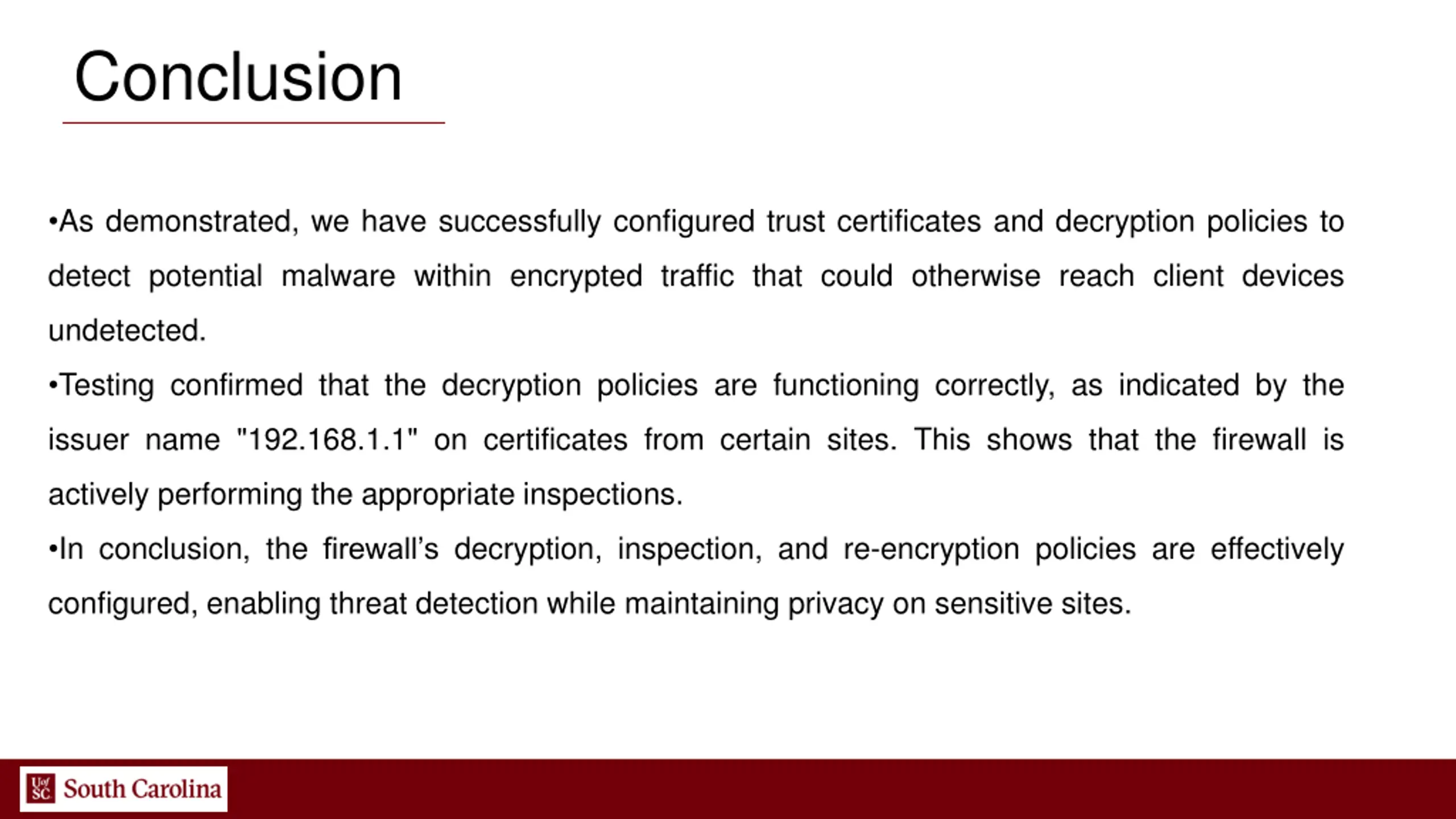 Conclusion As demonstrated, we have successfully configured trust certificates and decryption policies to detect potential malware within encrypted traffic that could otherwise reach client devices undetected. Testing confirmed that the decryption policies are functioning correctly, as indicated by the issuer name "192.168.1.1" on certificates from certain sites. This shows that the firewall is actively performing the appropriate inspections. In conclusion, the firewall s decryption, inspection, and re-encryption policies are effectively configured, enabling threat detection while maintaining privacy on sensitive sites. 14