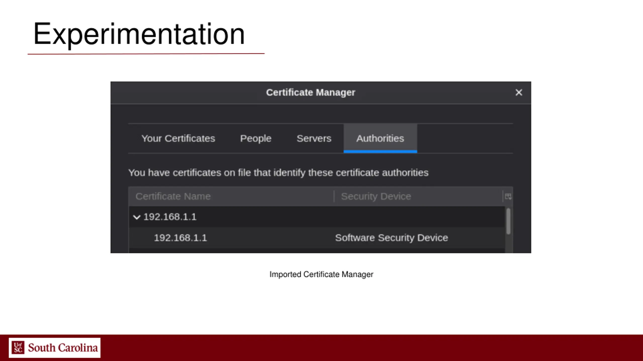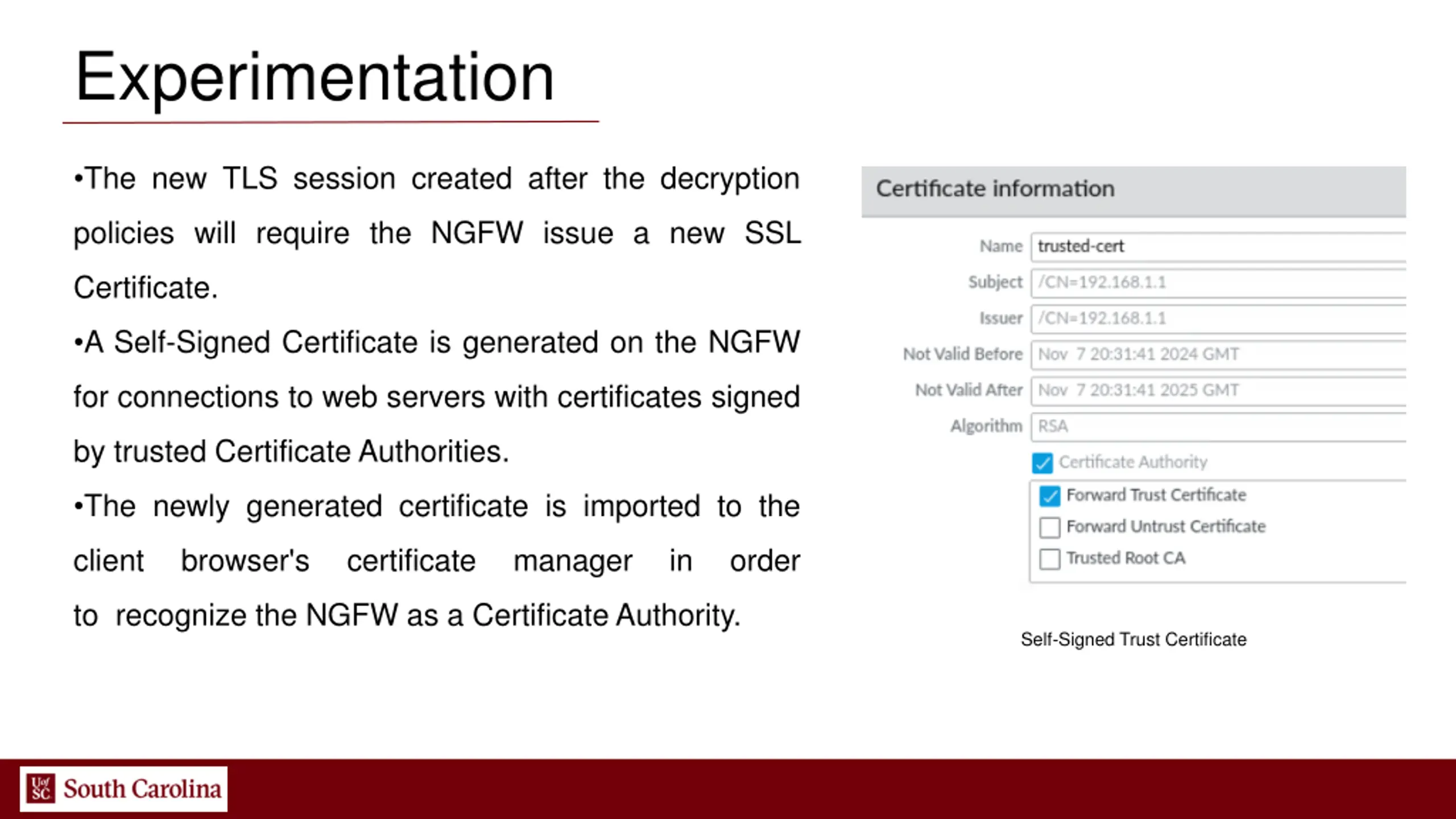 Experimentation The new TLS session created after the decryption policies will require the NGFW issue a new SSL Certificate. A Self-Signed Certificate is generated on the NGFW for connections to web servers with certificates signed by trusted Certificate Authorities. The newly generated certificate is imported to the client browser's certificate manager in order to recognize the NGFW as a Certificate Authority. Self-Signed Trust Certificate 8